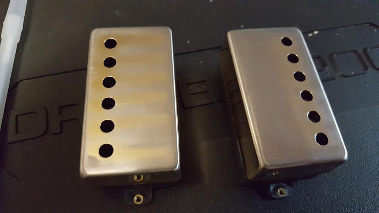 So I had a bit of time this evening and decided to try out the scouring attachment I got for my Dremel on my pickup covers. I used the photos I posted at the beginning of this thread as a guide for the amount of wear to shoot for. Here are the results (bridge on the left, neck on the right).
