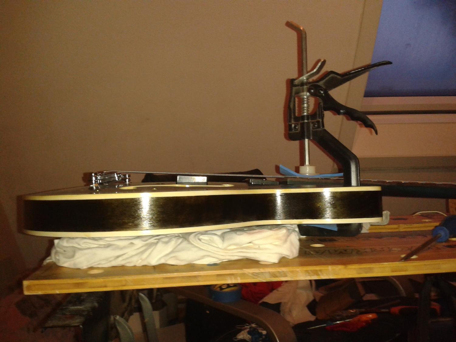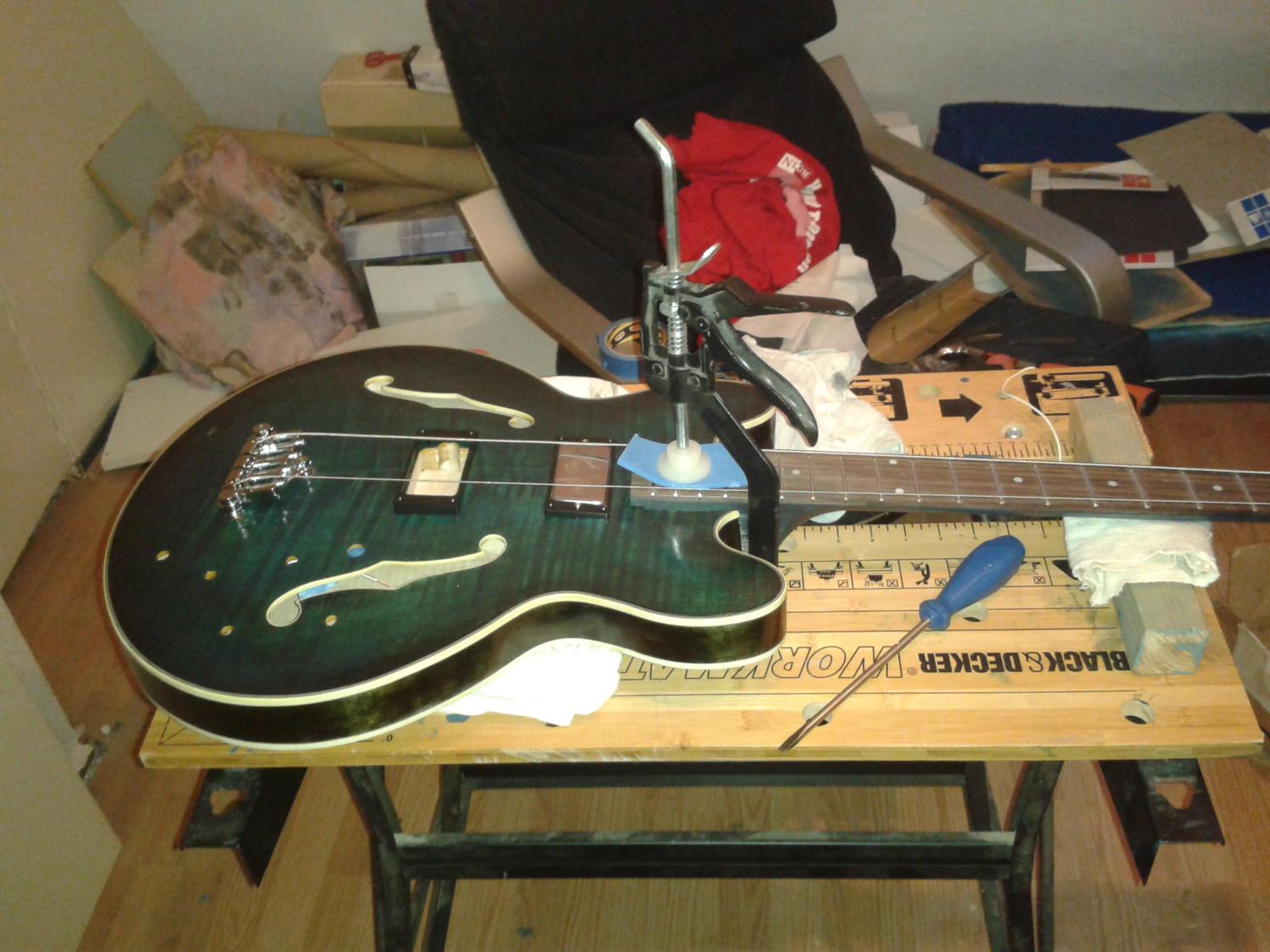 I needed the bridge and 2 tuners installed to check the alignment of the neck.. the bridge pins went in surprisingly well.. they seem to be in there pretty solidly.. i've been reading horror stories about those but mine seem fine..