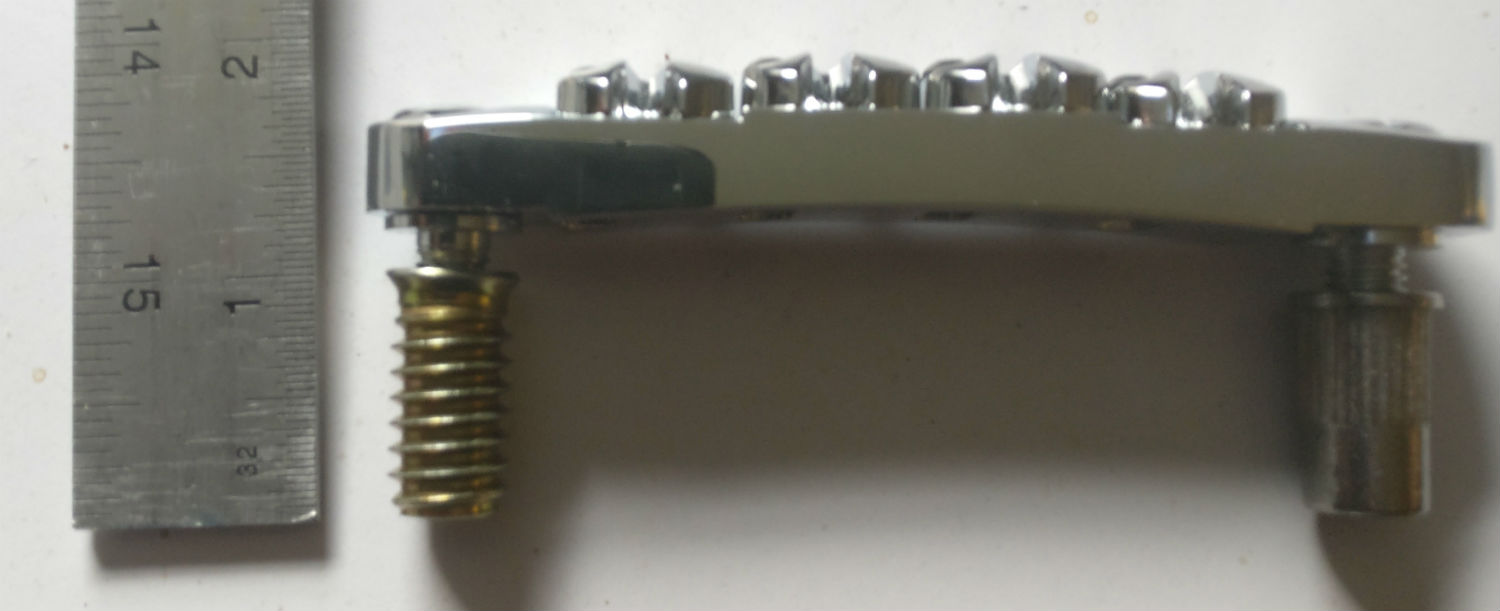 A lot longer than the standard bushings, it measures exactly 1.25" long, as it should do. It's an imperial size bushing, so I need to use the smaller diameter bolts (1/4"?) that came with the bridge instead of the M8s that fitted the kit bushing.