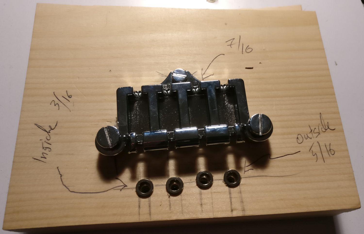 Since I had the my little drill press out, I also experimented with mounting the bridge, and string-through ferrules.
