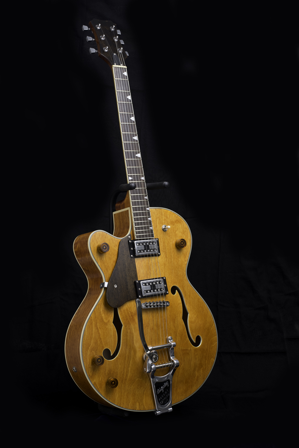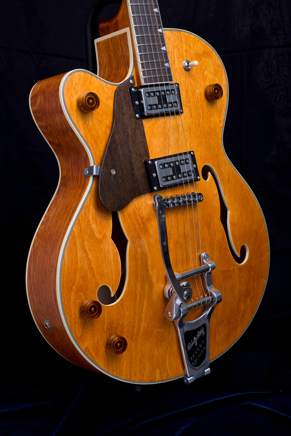 The Head Stock face and the Pick guard have some FW black added to the Golden Teak and Maple mix.