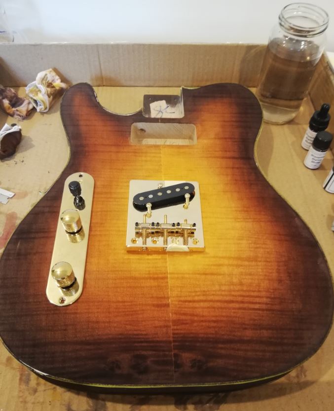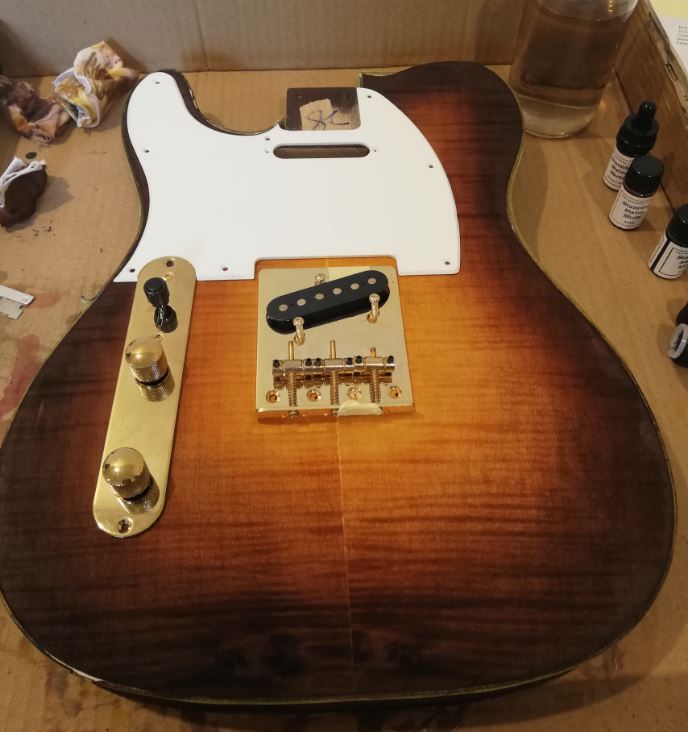 Just checked the colour with the golden hardware and it actually looks really nice (this was something I was really uncertain about, but the guitar kept telling me to dress her in a burst, so what do you do:D)