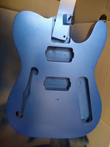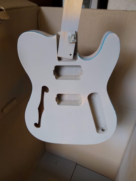 Got the first set of 3 light filler-primer coats. This afternoon when lightly sanding back with 320 to knock off the loose wood fibres I realised that the join between planks on the bottom of the body had opened up. While I partly blame the exceedingly hot and dry weather, I also suspect it was like that before the primer went on and I didn't notice. Anyway, I sanded that part back to timber, de-dusted with a tack cloth and then on with some more CA glue.