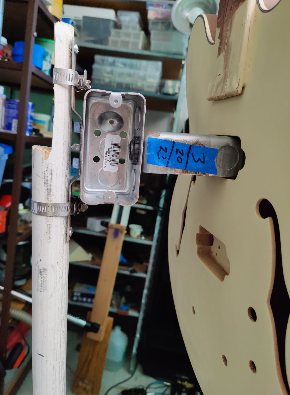 Others have used a G-clamp that’s clamped between the two pickup routs to give them something to hang the body from.