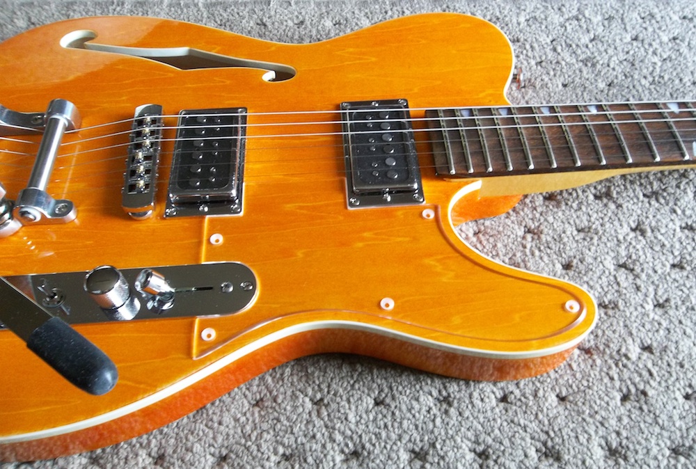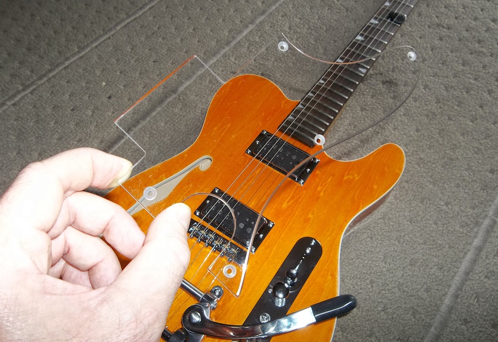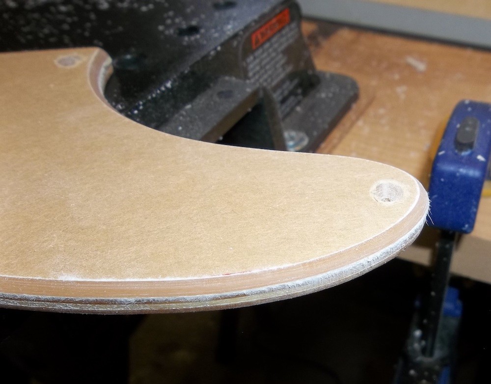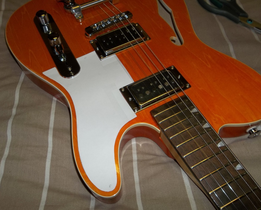I originally planned not to have a pickguard on this build, but with the switch to Tru-Oil I'm re-thinking that decision. TO is fairly soft finish and I'm worried that it won't take long for a bit a strumming to wear through and expose the orange Dingotone, which would be a major problem. So, I'm thinking a clear pickguard could be the solution.
