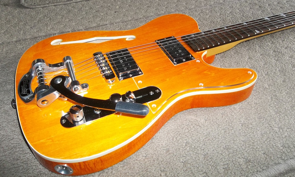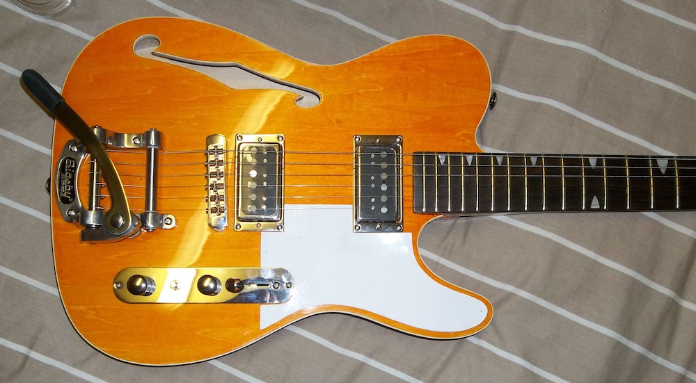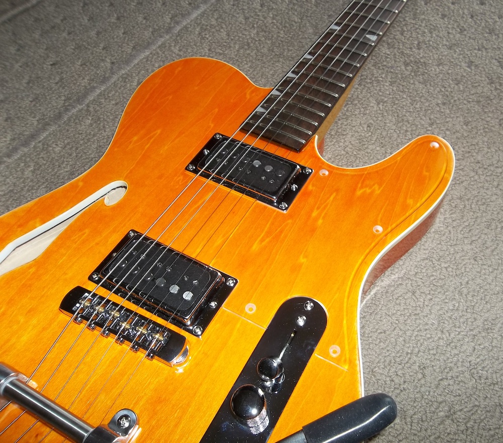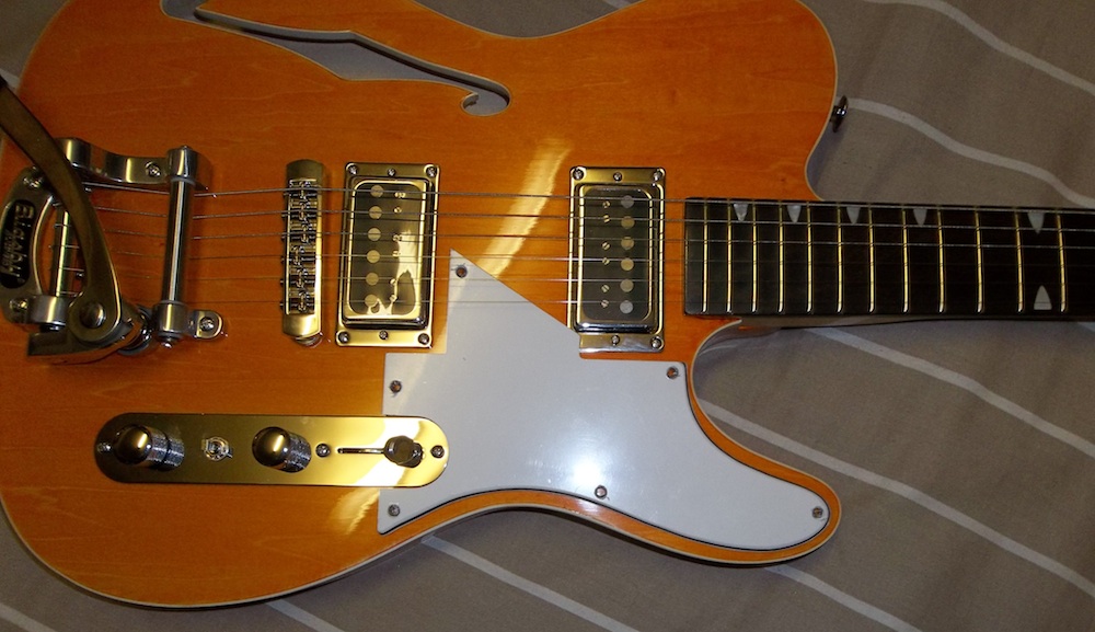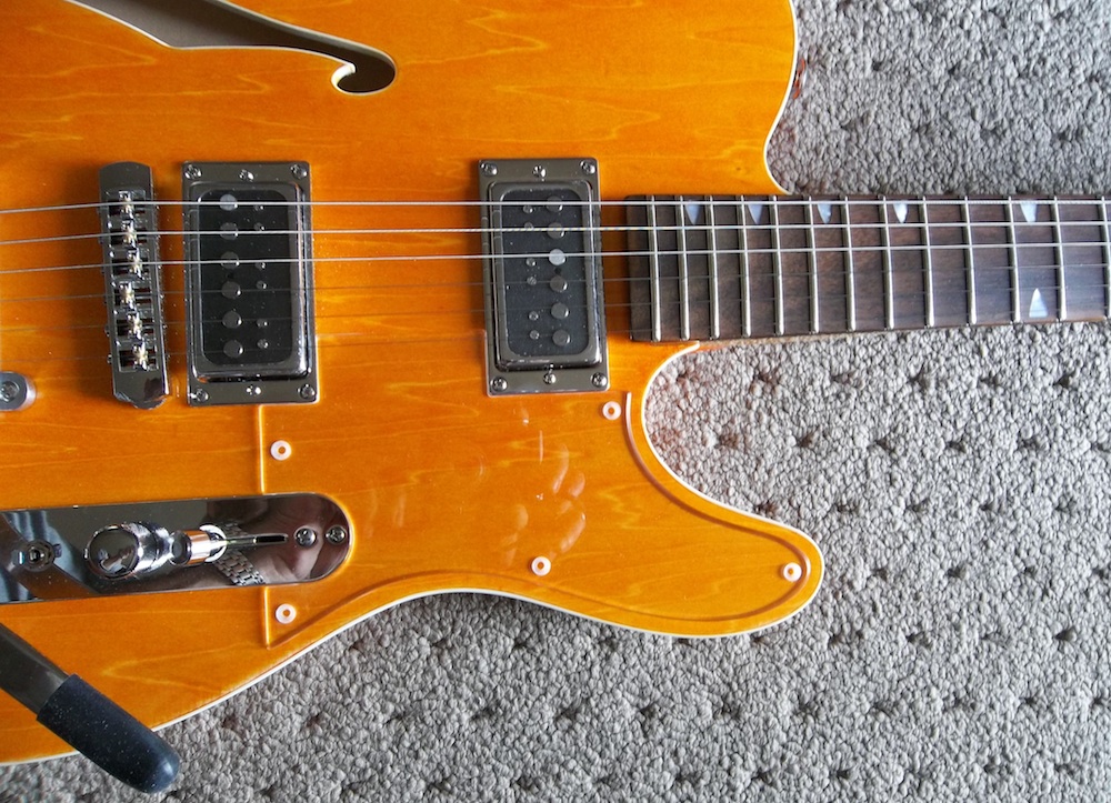 I originally planned not to have a pickguard on this build, but with the switch to Tru-Oil I'm re-thinking that decision. TO is fairly soft finish and I'm worried that it won't take long for a bit a strumming to wear through and expose the orange Dingotone, which would be a major problem. So, I'm thinking a clear pickguard could be the solution.