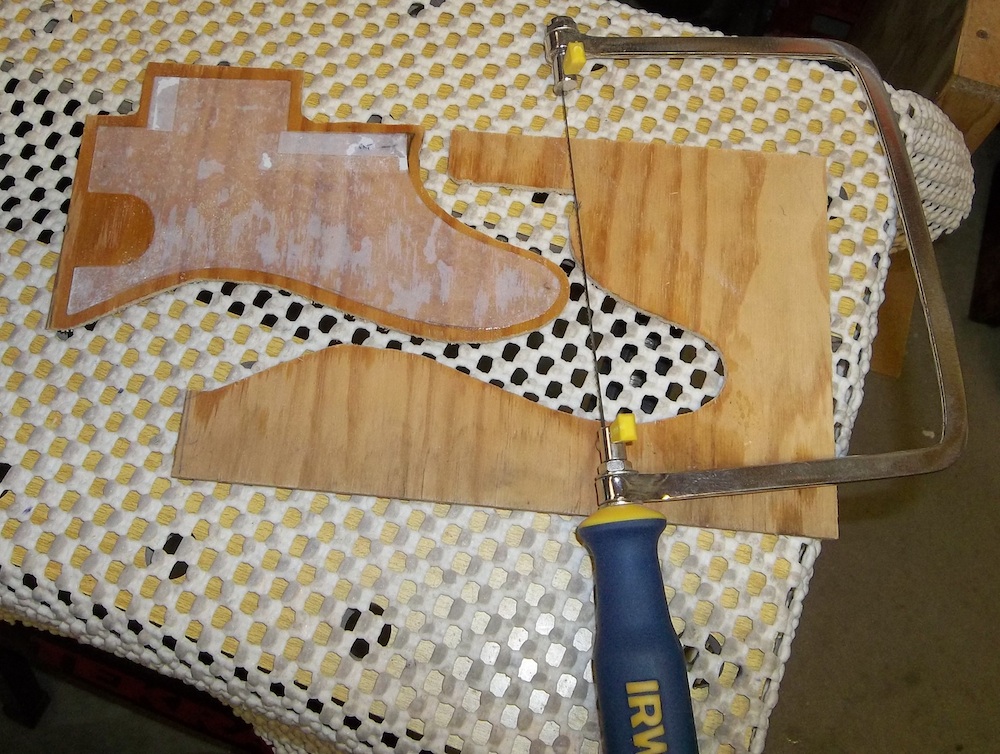 Rough cutting 2mm clear acrylic to shape (coping saw again). I need the template to be on the back of the pickguard plastic to enable one of the later steps, so I do that from the start. The risk is that if you're not careful you can scratch your nice new soon to be pickguard face before you've even cut it to shape and taken the wrapping off.