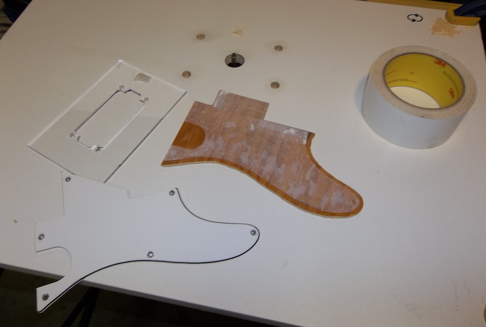 To shape the template I'm starting by routing the straight edges (using a humbucker template) and then the control plate cut out using the stock pickguard. Double-sided tape is your friend.