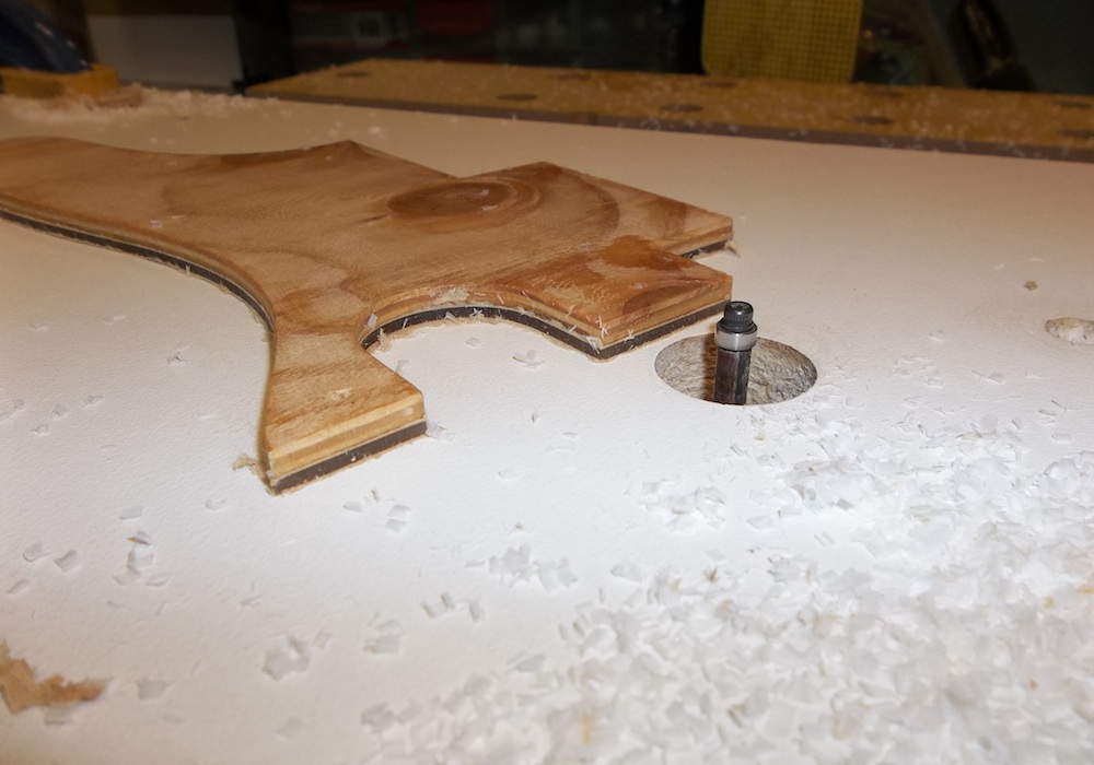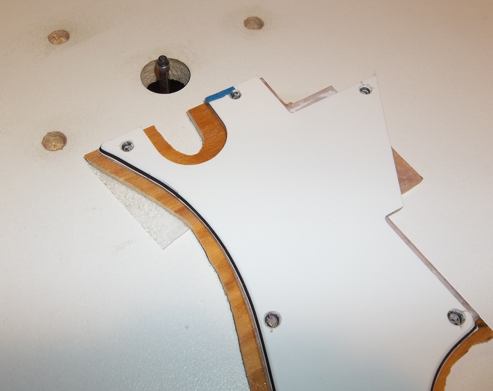 Carefully routing to shape, lots of light passes working my way up to the template's edge. Pickguard is face down with the template on the back.