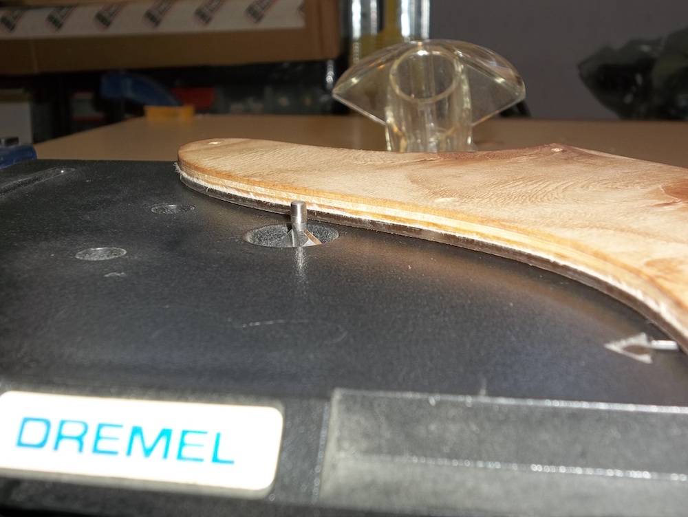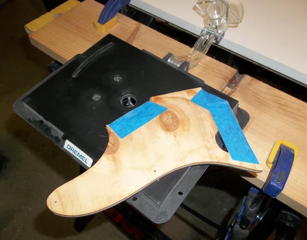 To bevel the edge I'm using my Dremel routing table and a piloted chamfer bit. The pickguard needs to be face down with the template on the back for this to work, as the pilot bit needs the wooden template edge to run along (it will melt plastic). It's difficult to detach and re-attach a template and get it to line up perfectly, which is why I've been doing all the shaping with the template on the back from the start. The blue masking tape is to remind me which sections not to bevel.