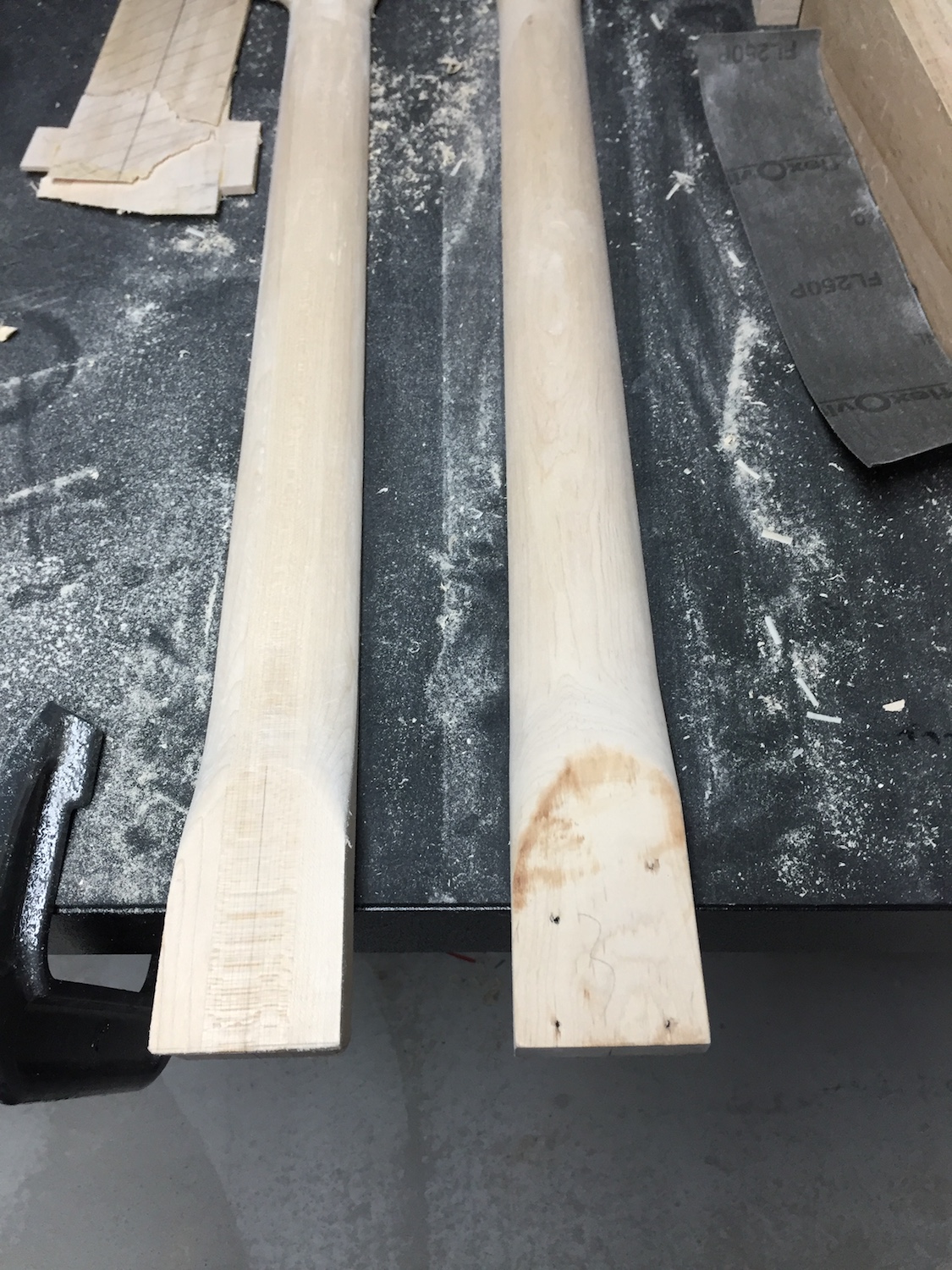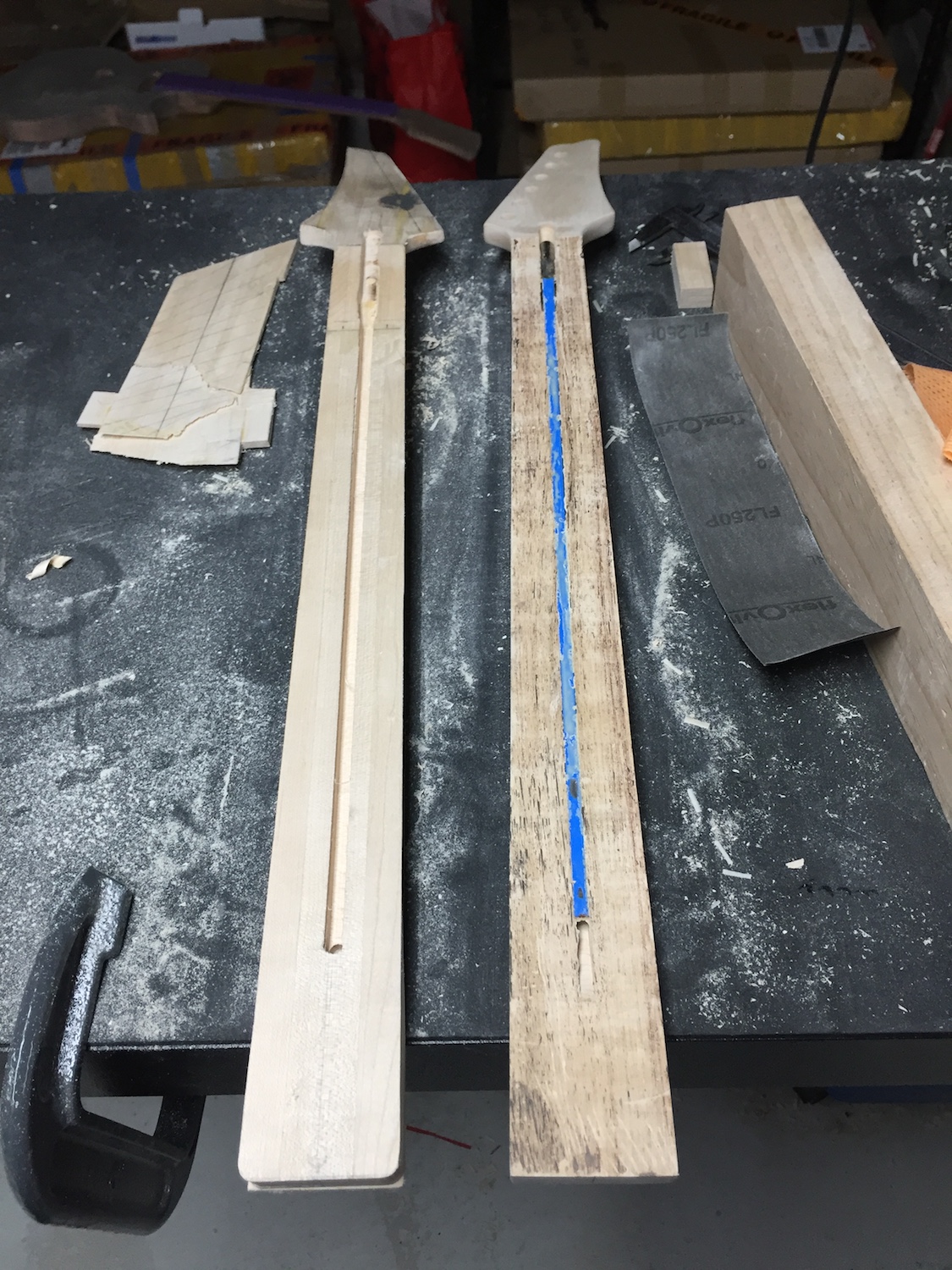 So, on the left, FrankenLab's scarf jointed neck building effort, the right is the factory neck, less FB from my SV-1 kit.