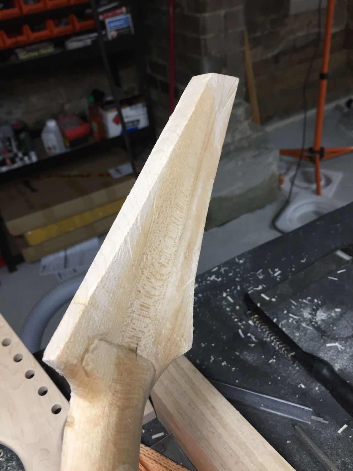 The upshot is, I was a little too impatient in thinning the headstock. Rather than considering what need to happen and the likely pitfalls and issues, I charged off and tried to take a lengthwise cut down the rear of the head to thin it out from 3/4" to the standard 1/2".