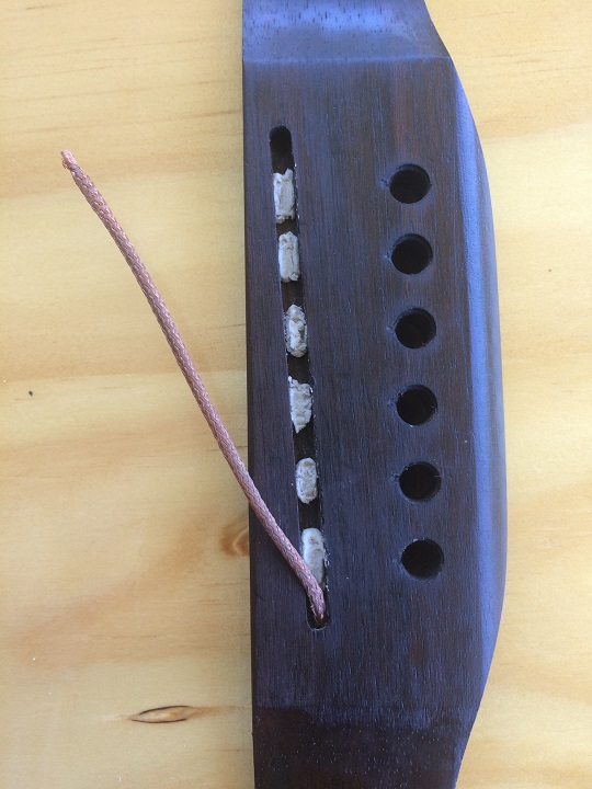Problem (b). Using only hand tools and with my limited skills I had no way of leveling the floor of the saddle slot so I resorted to using air drying clay. (Why clay? Because clay doesn’t adhere to anything but itself, so if it doesn’t work it should be easy to remove and I could progress to plans B, C, D…..Z.) I had read that putting a strip of clay under the piezo would do the trick. However I was concerned that some of the clay would be squeezed out and cover the top of the pickup so I decide to modify this a little bit and put a small dollop (a technical term used by us clay-heads) of clay on the slot floor under each string. My theory being that as the clay has a 24 hour drying period I could tension up the strings and the clay had enough time to self-level and support the piezo and saddle before it dried hard.