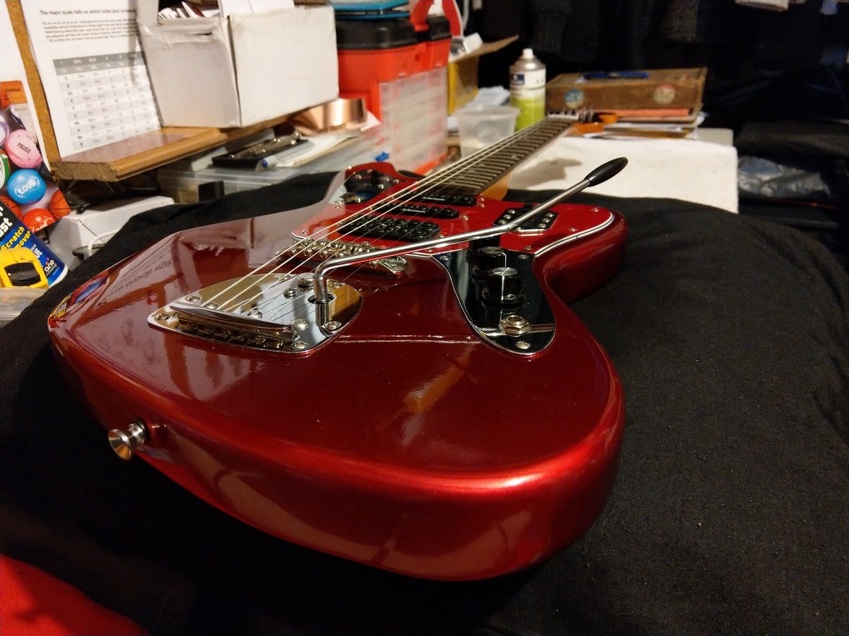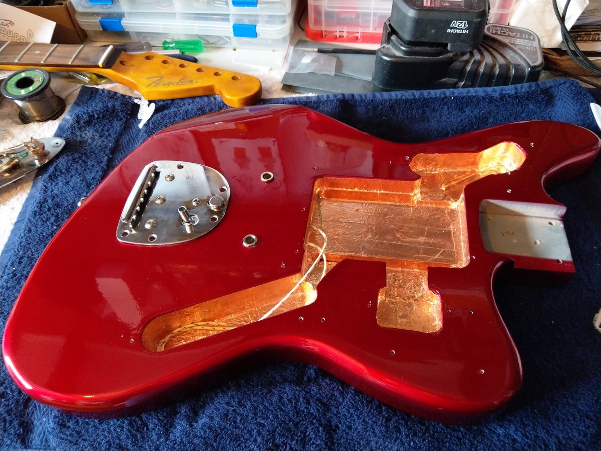 You don't need to run ground wires to the cavities if you run tape over the top of the body so it makes contact with the taped underside of the pickguard, preferably running up to some of the screw holes so the contact area is under pressure. It's not quite so pretty with the pickguard off, but you can't see it when it's assembled and it makes taking it apart again a lot easier.