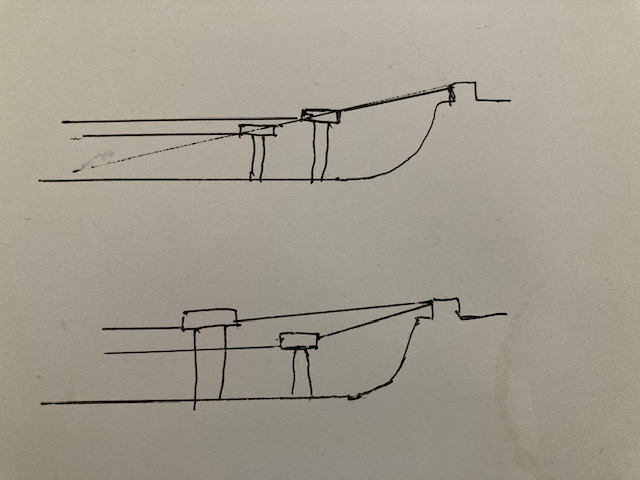 A quick sketch (absolutely not to scale) shows why the furthest forward tree has the tallest post in order to get the string break angles similar