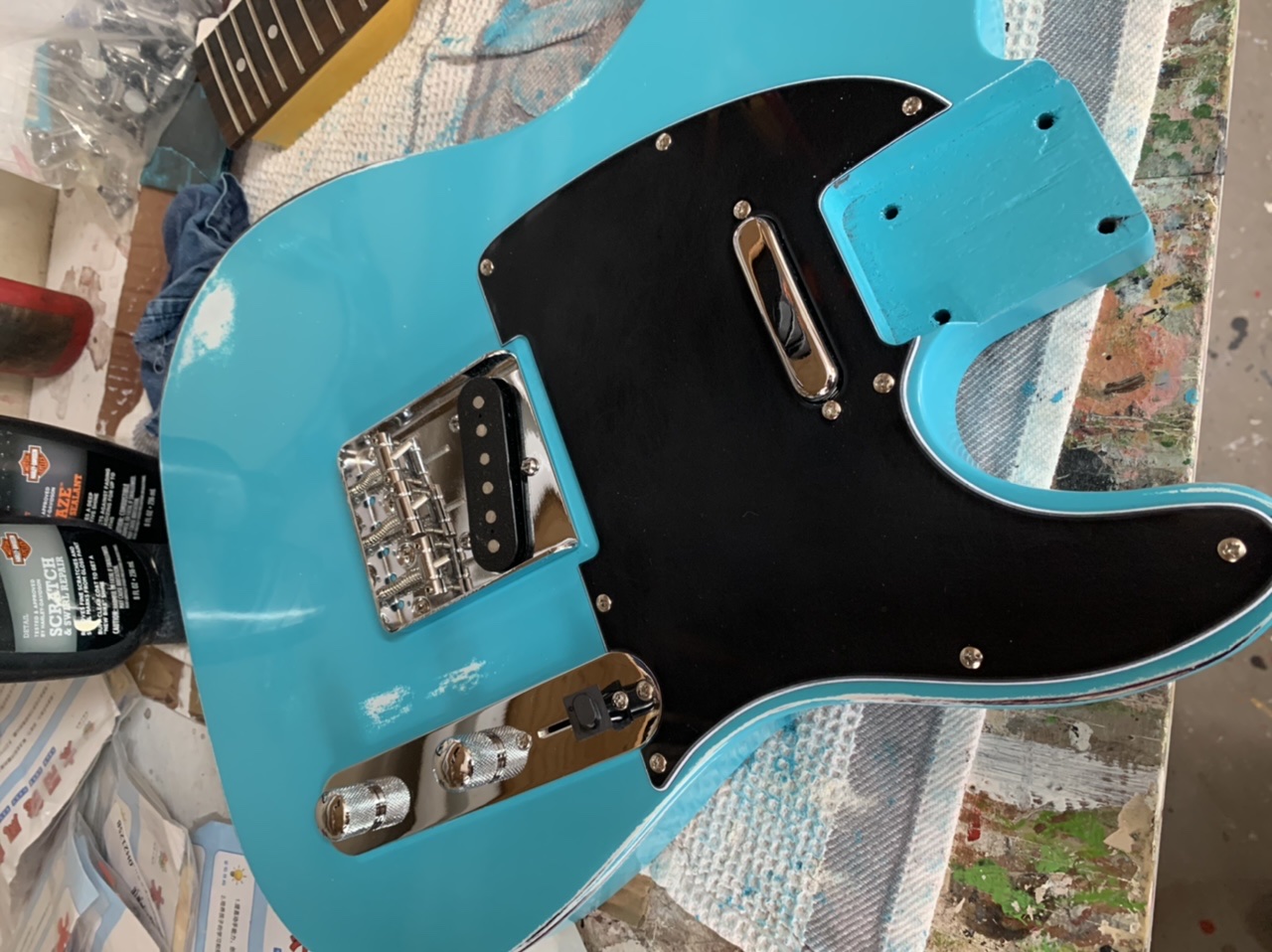 I think I have decided on a finish. Building this for my sons teacher as a surprise gift at the end of the year. Did a sunburst on the mahogany body and clear coated it, but wasn’t keen on the look, it came out as a brown sunburst. So I repainted. Light sand and coat of rustoleum enamel primer and colour, let it set, wet sand 1200 grit keeping off the holes and cut and polish, kinda designer shabby paint!