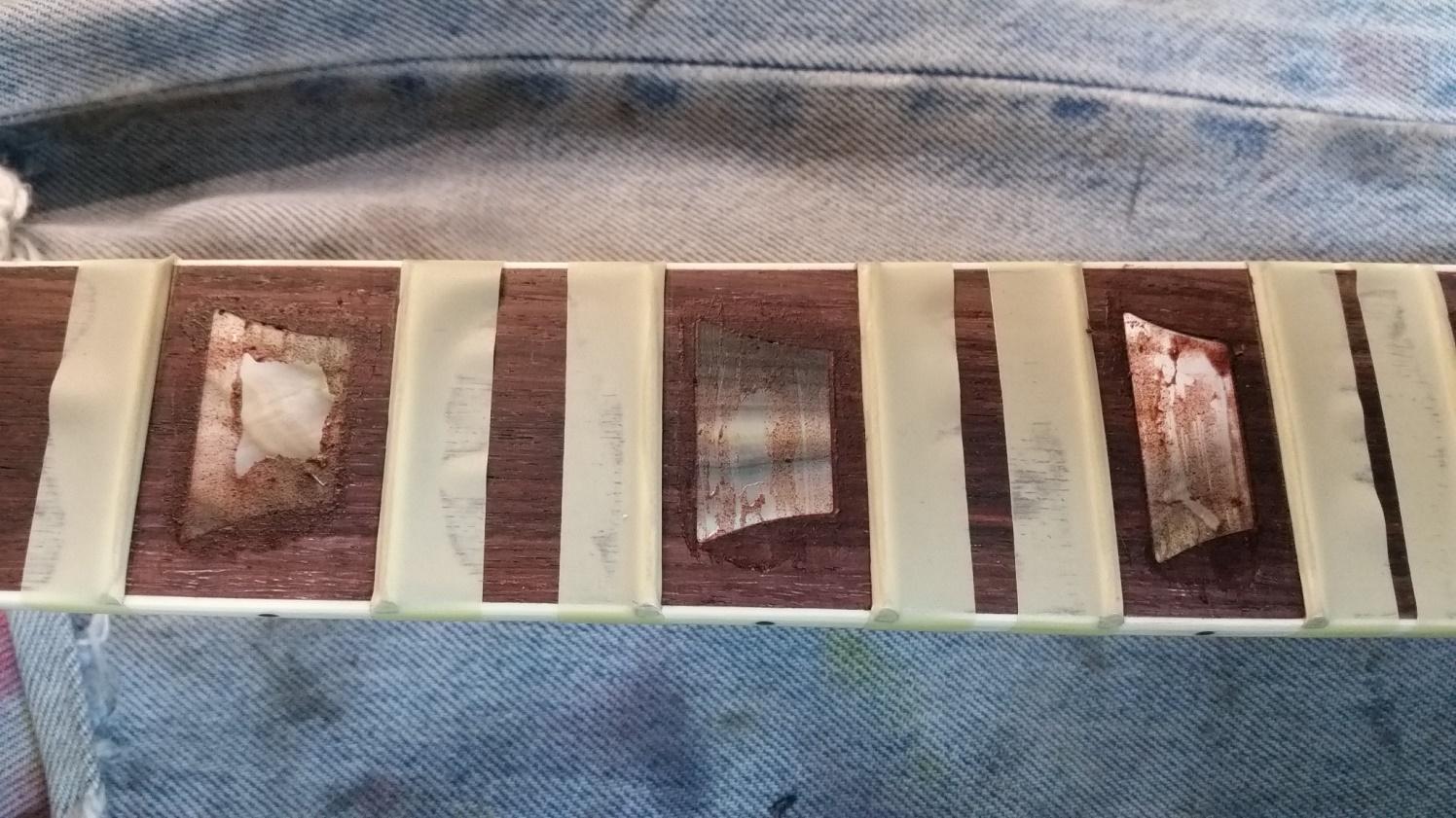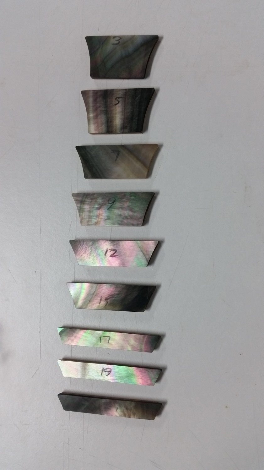Side dots were easy enough to drill out and replace, although one or two I drilled slightly off perpendicular and there are small gaps but I think they will fill up by the time the finish is on. Removed the plastic inlays partly by drilling a hole and digging them out and then saw Tweaky's trick of using a soldering iron to soften the glue underneath to get them out. Couldn't get them out in one piece but had pieces big enough to measure the thickness. They ranged from around 2.4mm to 2.75mm, quite a bit thicker than the pearl replacements. The top three were about the same size, 12 and 15 were smaller than the stock ones and the lower ones were slightly longer than the cavities. Carefully made the cavities larger and cleaned up the glue residue.