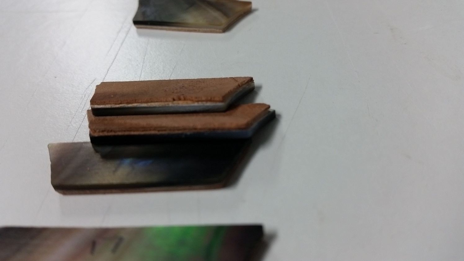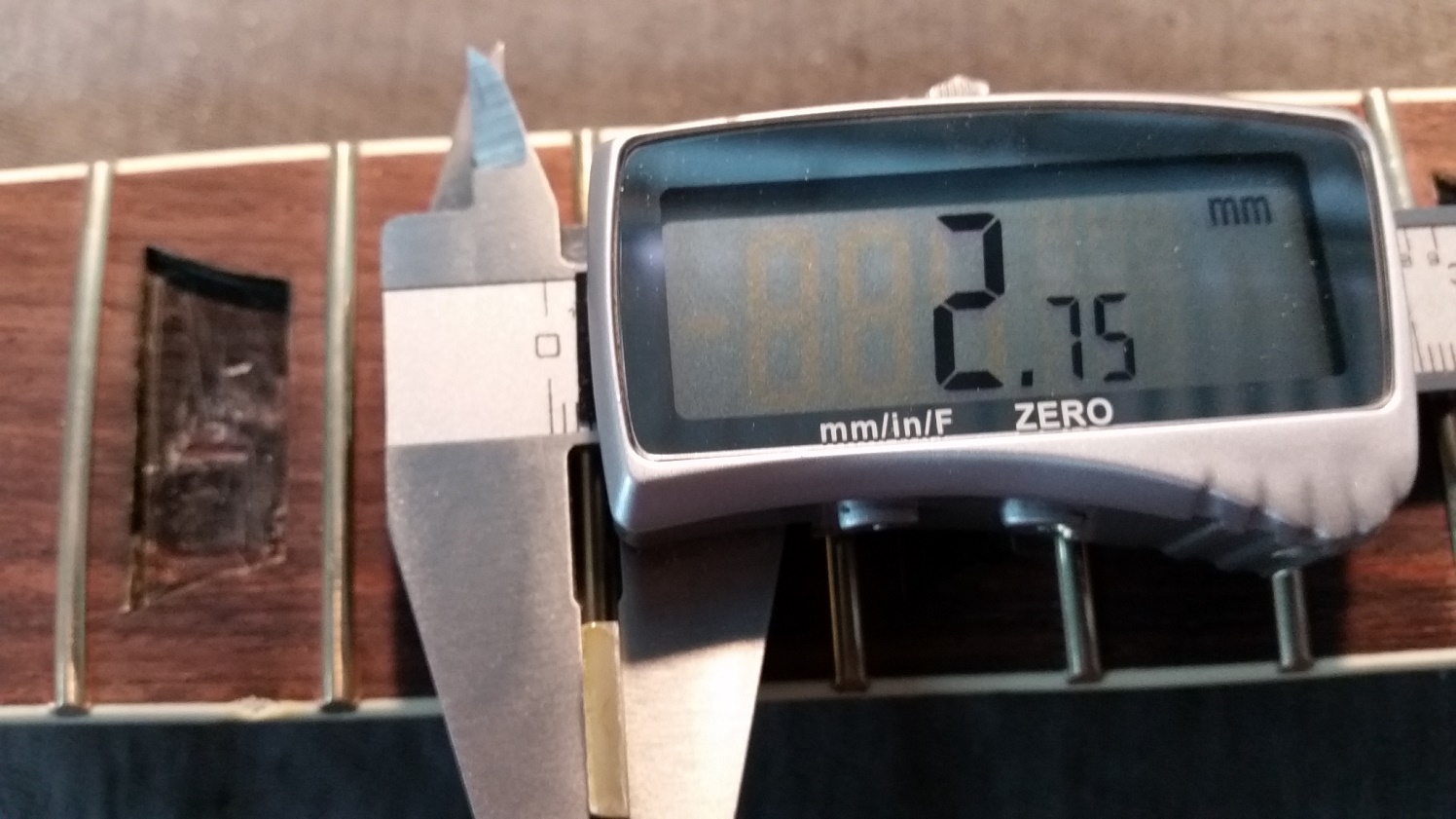 After some head scratching I figured the simplest way to make sure the new inlays were at the right height in the middle of the fingerboard was to glue some veneer pieces to the back of the inlays with CA glue. In this case, two pieces were pretty much spot on.