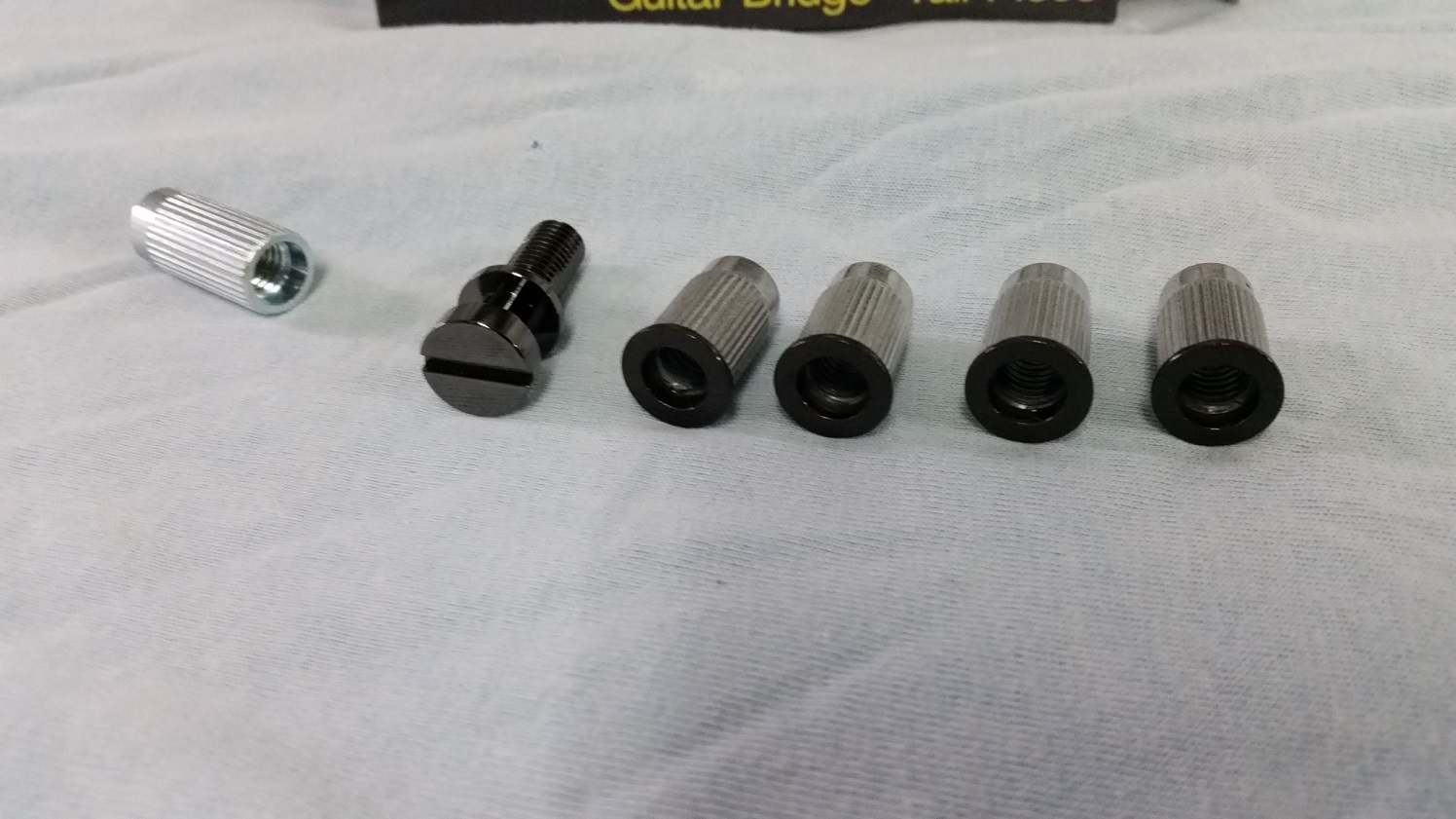 Went to install the bushes for bridge and tailpiece and they dropped in the holes with no effort at all, not good. I bought Gotoh pieces and only checked they fit by using pvc tubing in place of the bushes, but didn't think to try the actual bushes in the drilled holes. With all the finish coats on it was a bit late to plug up and redrill holes but managed to dodge a bullet by using unused bushes from previous builds. Sanded the chrome and painted the shoulder with some charcoal left over from the esp build. New hardware is cosmo black and the charcoal doesn't quite match but is close. Threaded a M8 bolt into the bushes when knocking them in to avoid chipping the paint off.