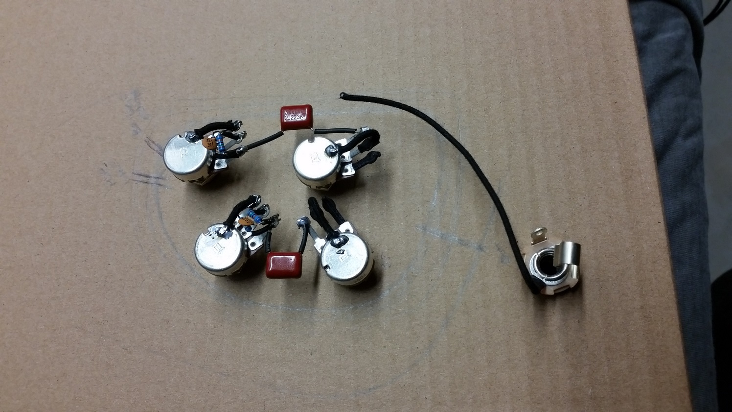 Also have the wiring started. Thanks to Fretty for posting a link to Gib wiring schemes a while ago, followed the Firebird V scheme. I'm using P90s and have read to use 300K pots with them, after some more reading have found you can make your own from a 500k pot with a 1M resistor soldered across the outside lugs. Works out to about 330K, and added treble bleed circuits as well.