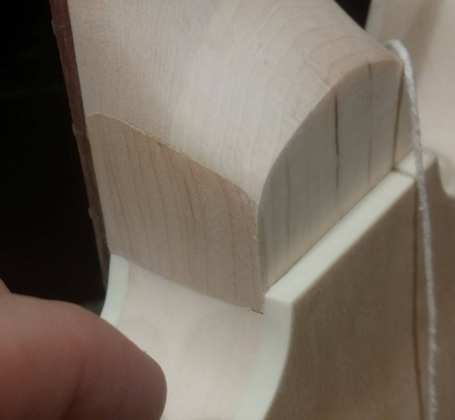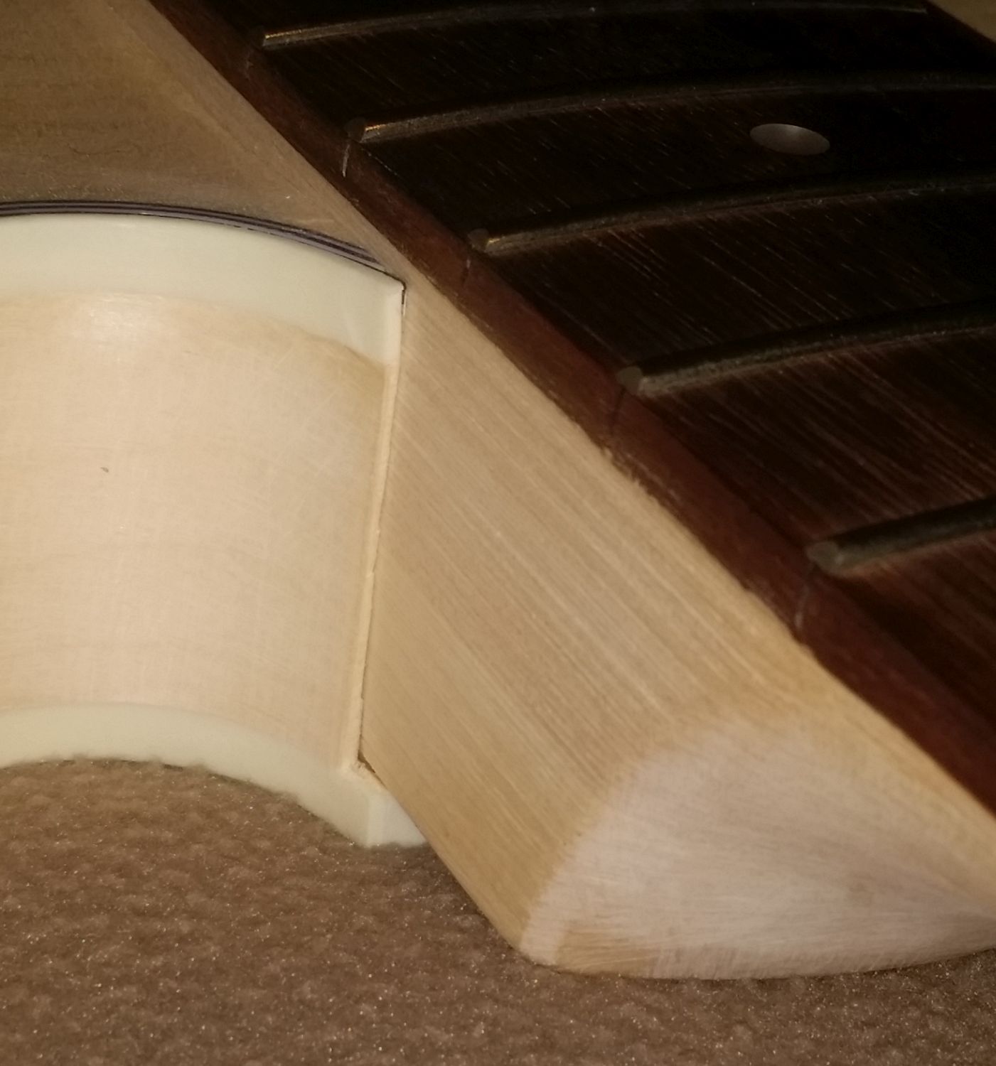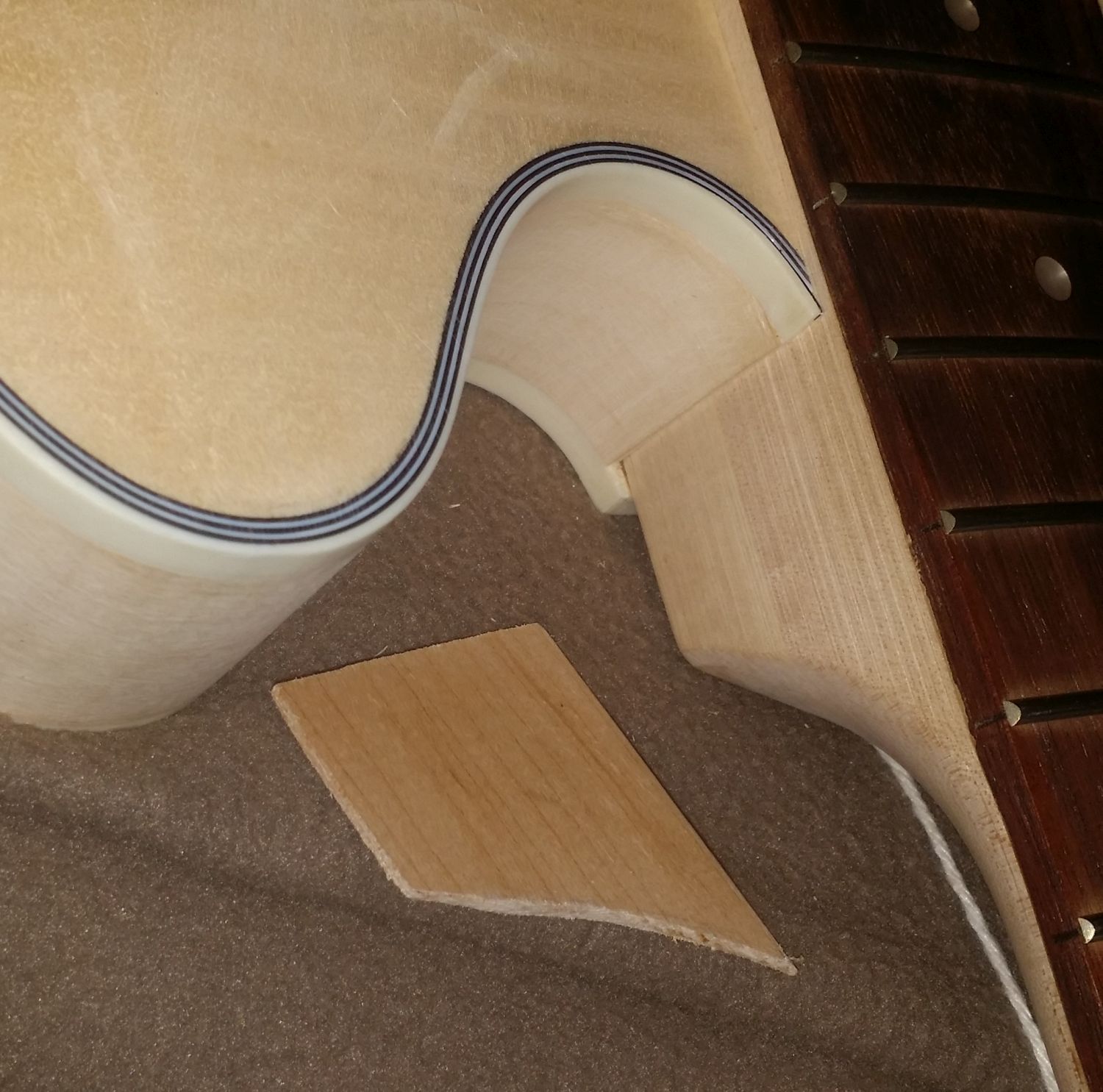 What I finally decided to do was to see if I could cover the space with a little piece of maple. The maple I have is a bit darker than what the neck is made of, but I thought it might not stand out if I matched the grain and covered a relatively large part of the side. So, I cut a very thin piece with a coping saw.