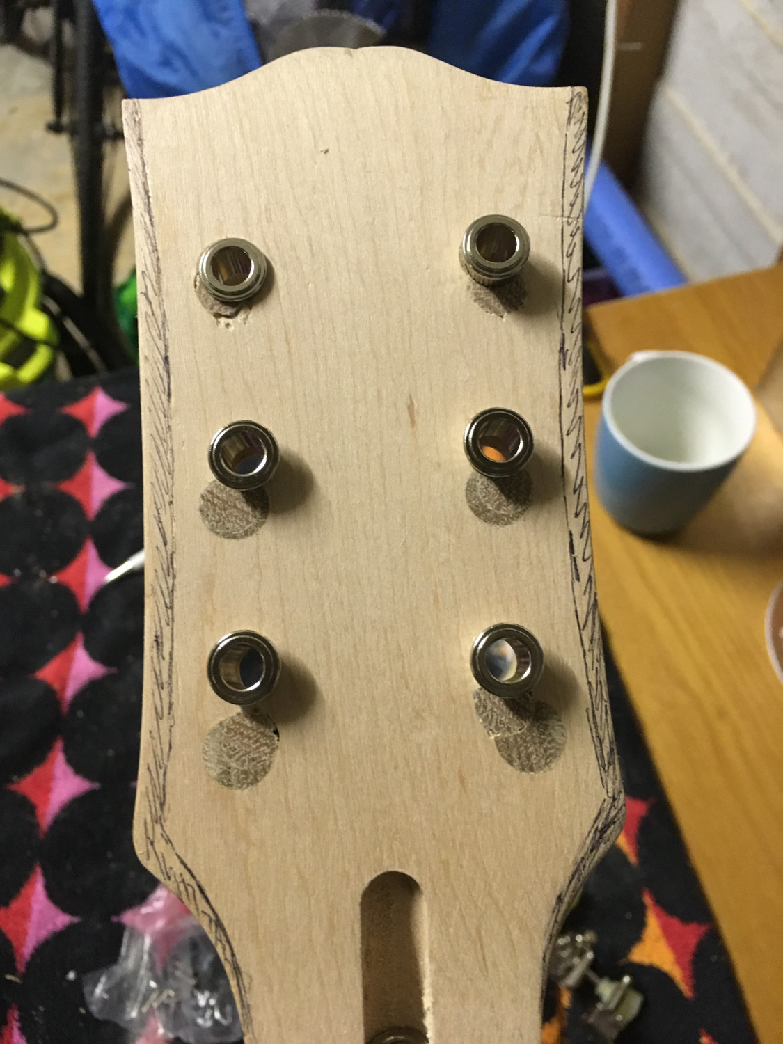 My oh my, long time between updates on this one... So whats been happening. Well, I completely stuffed up the machine head hole re-drill (using hand drill with jigs) to the extent that I had to put this project to one side and take some deep breaths. Anyhoo - since scored a cheap drill press so re-plugged the holes again yesterday, sanded flush today & re-drilled the holes. Soooo much easier with the drill press and happy with the result. I used a small drill bit to make pilot holes then a 11/32 drill bit for final hole. The vintage sized bushings push in nice and snugly. Not 100% perfect but close enough for me and a good learning experience.