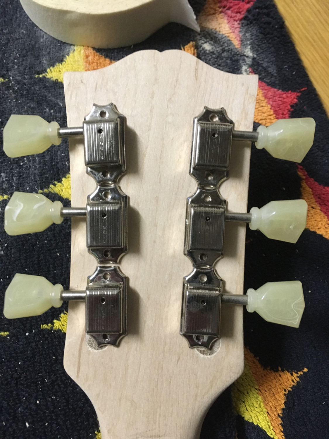 And a small change in plan - I've acquired some Kluson vintage tuners (individual). They all sit nicely in the new holes. The original 3-on-a-plate will be used on an upcoming LP Junior project (single cut)......
