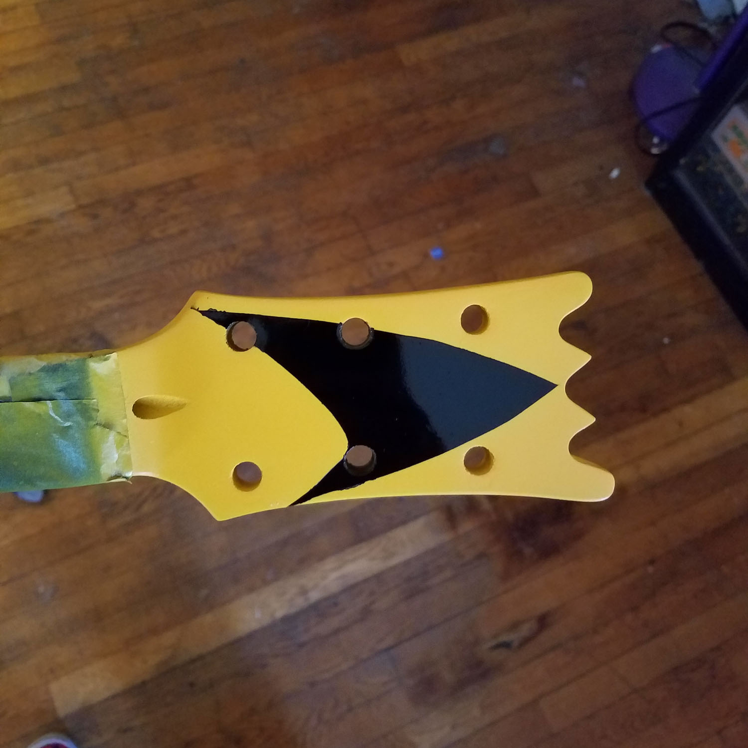 Hope this image works. I did a 60s' "flying wedge" on the head to offset the black pickguard. The stencil bled in a couple of spots, but I should be able to fix that with the model paintbrush.