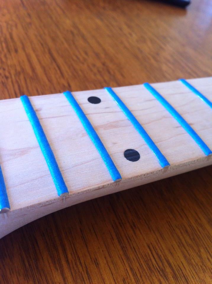To avoid having to scrape clear coat off the frets at the end, I taped them... All of them.... And the nut slot too...