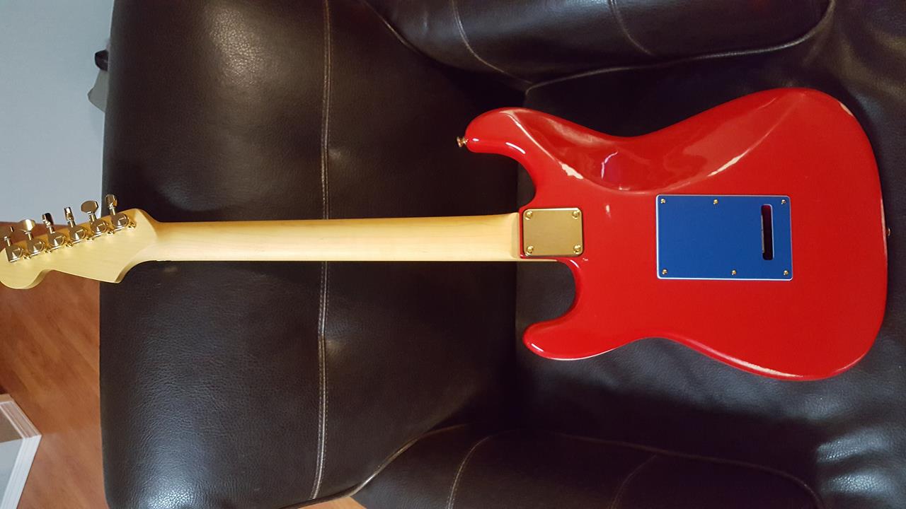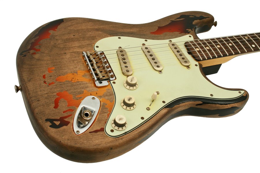 I'd suggest that as you are relicing this, you really need that upper bout edge with the big sticker on to get a lot more of the relic treatment to make it look convincing. That's where you are always going to get the most wear from your right arm. Just look at where your right arm touches the guitar when you're playing, and add a bit more wear there.