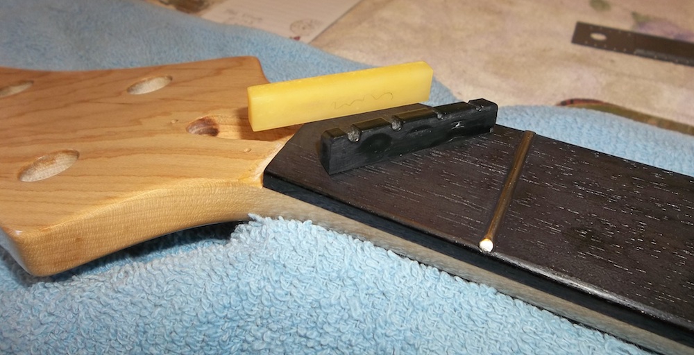 As part of the 'try something different' aspect of this build I wanted to see if I could cut a nice low nut for it without having the strings on, without the bridge on, without even the neck on the body. Basically, can I make a decent bone nut that won't really need adjustment using just the neck as a guide.