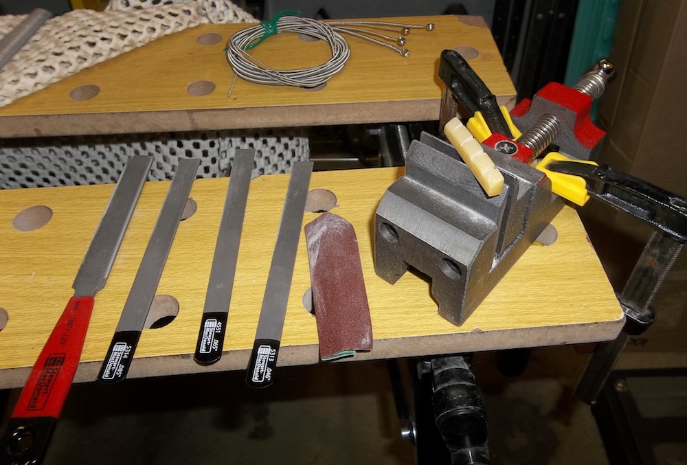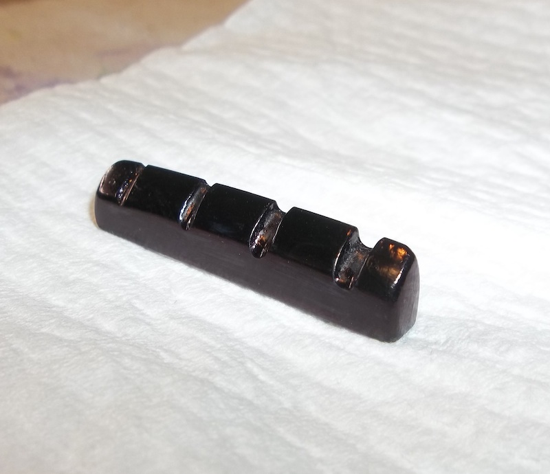 Rough shaped the nut and slots cut slightly short of their intended depth. I much prefer the single size black handled flat nut files, they're easier to use and have a better cut, but I had to resort to the larger two-size edges one for the 105 E string. Cut as 046, 065, 085, and 105 and using the stock strings to how they sit in the slots.