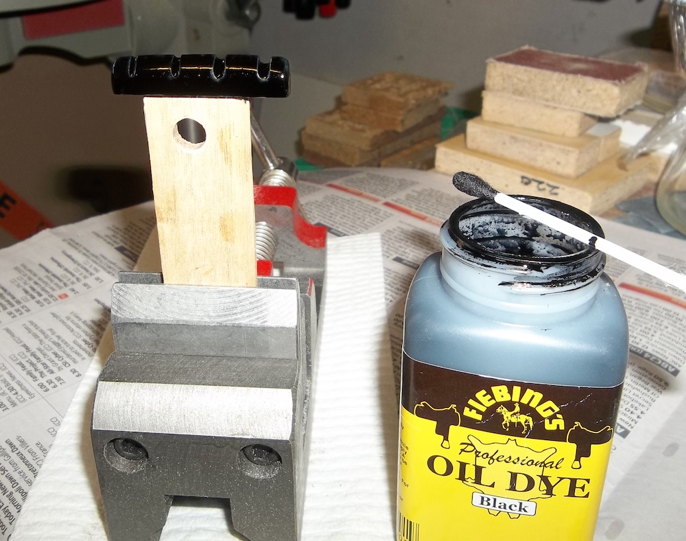 Given that the build will have black hardware and a dark fretboard a pale bone coloured nut won't really match, so time to see how well bone takes stain. I didn't want to immerse it in any stain to thoroughly soak it for fear of the bone being weakened, so I decided to try the Fiebings once again (with my favourite type of Fiebings applicator).