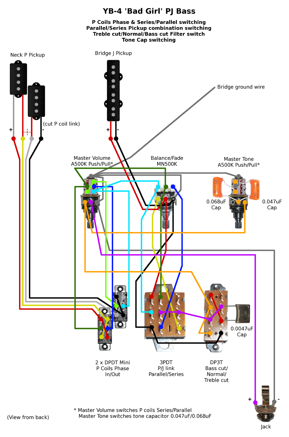 The idea was to test a few things for future builds, but also to make a versatile bass with a wide range of sounds. It's a P J bass so there's always a compromise between the potentially noisy single coil J bridge pup and mostly hum-free split coil P neck pickup. The four switch block in the back of the control cavity shown at the start of this thread is only part of the grand scheme, the circuit also needs a couple of push/pulls and a balance pot. The switching plan is this:
