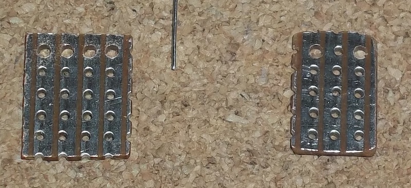 Due to the potential complexity of the wiring, especially in the tiny little control cavity, I didn't want to have to pull it all apart if I ever wanted to change out the pickups. So, I cut two small pieces of Veroboard that will sit in the pup routs to act as links between the pickups as the wiring loom. Then it should be easy to swap them out if needed.