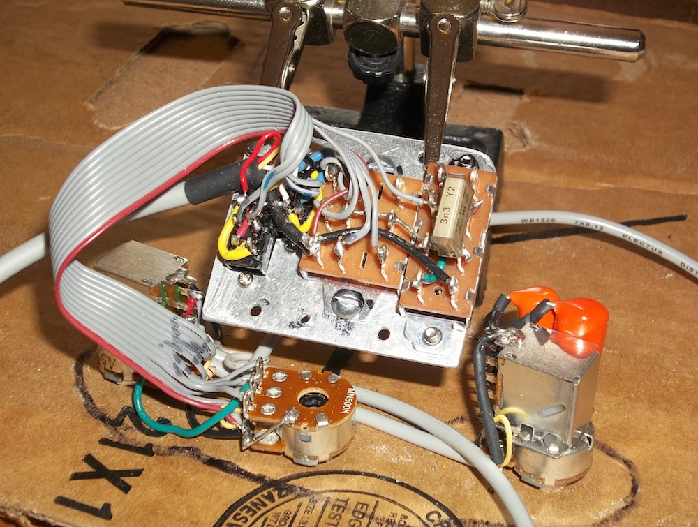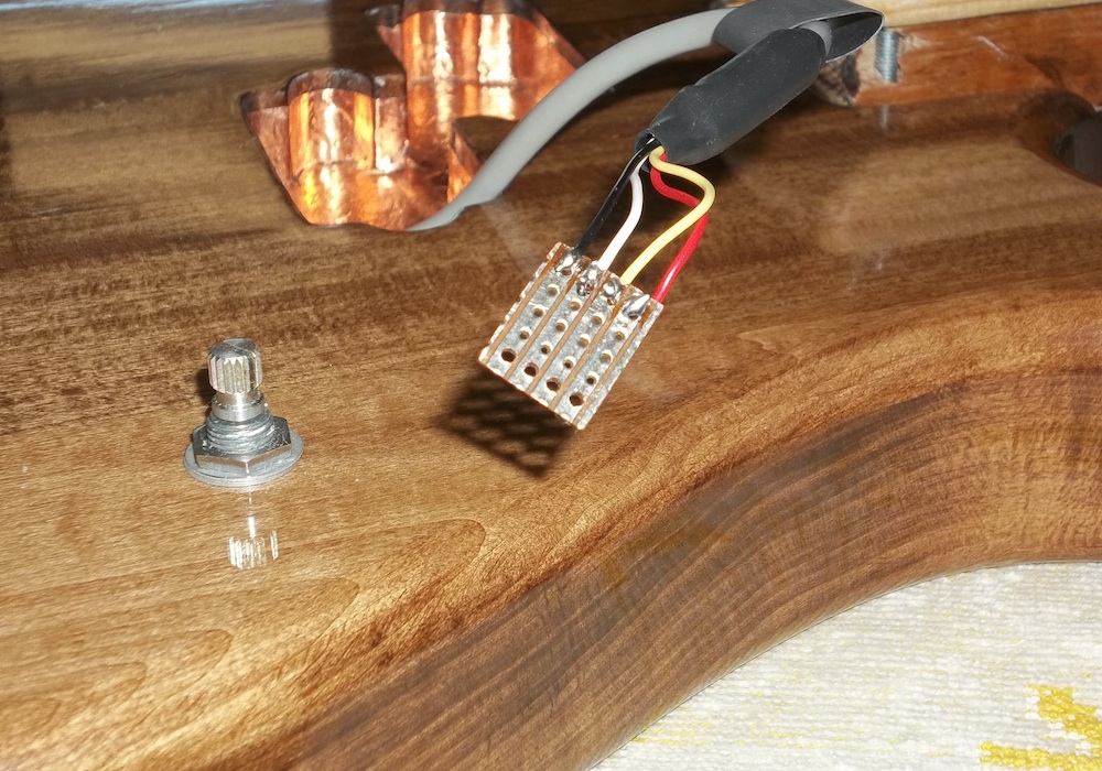 Adding the Veroboard link for the P pickup. The large piece of heatshrink on the wire will slide over the board once the pup is connected.