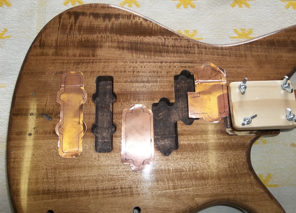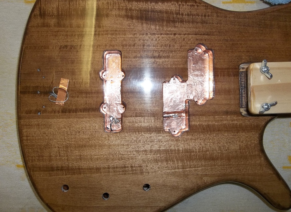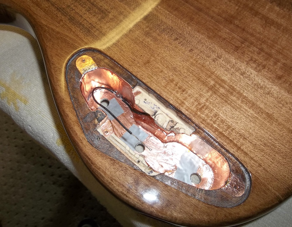 Ground wire linking the shielding in each cavity soldered in place, and solder joins added to ensure connectivity between each section of copper tape. Bridge ground wire looped and temporarily held in place with a copper tape scrap while the other end is permanently soldered to the shielding link wire in the bridge pup rout.