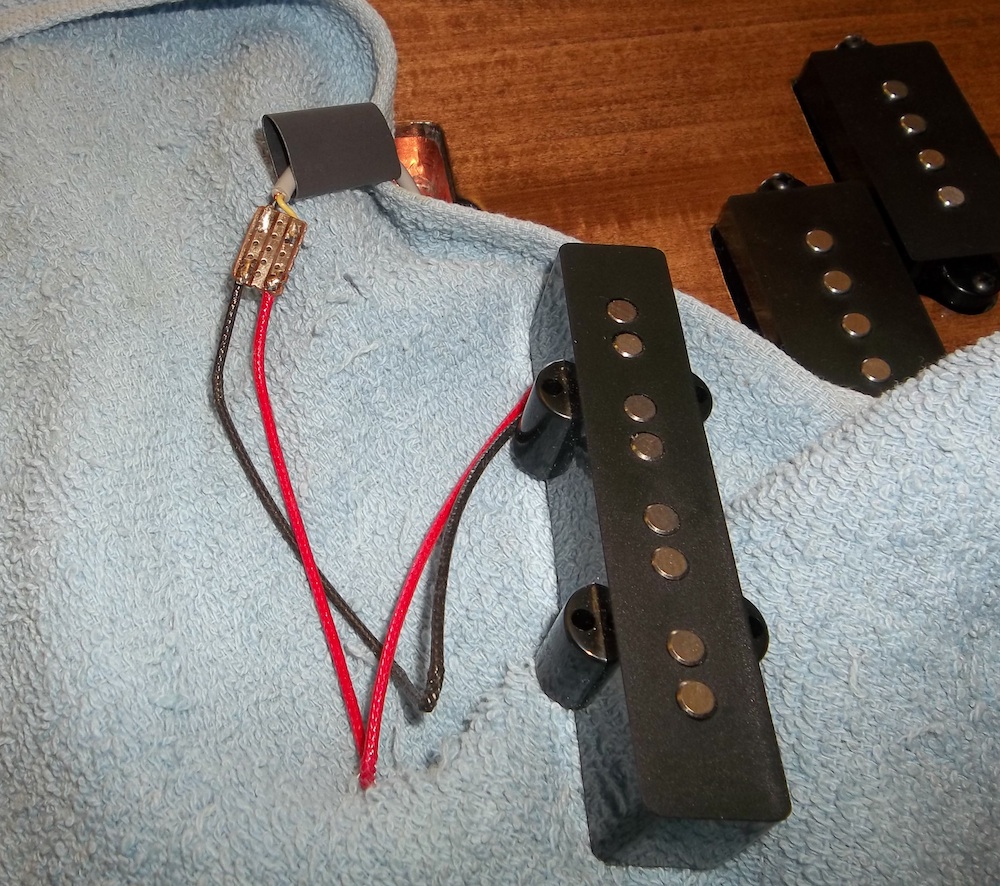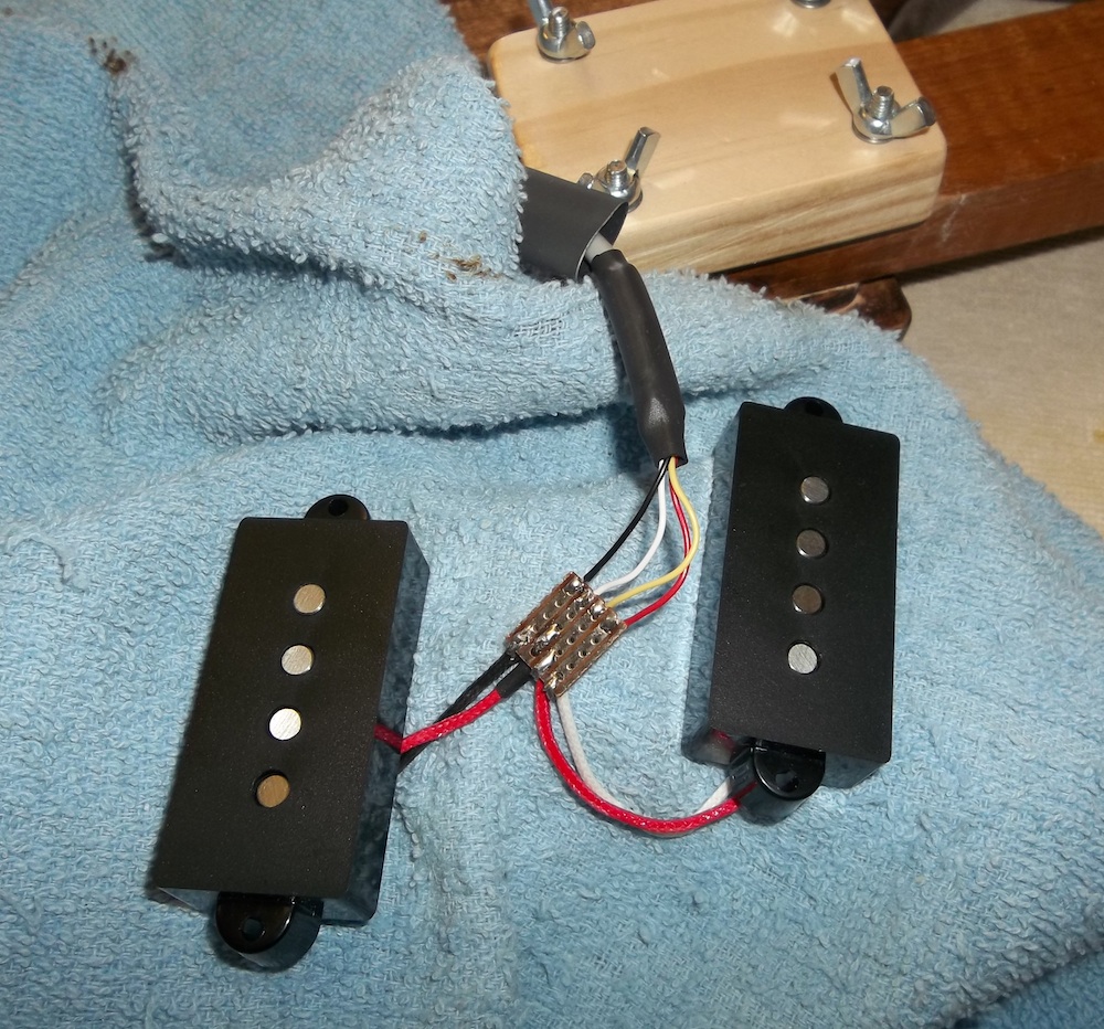 To make the circuit work I needed access to the individual coils of the P pickup… which meant cutting the coil link wire, not something you normally do. I'm actually using GFS pups in this build.