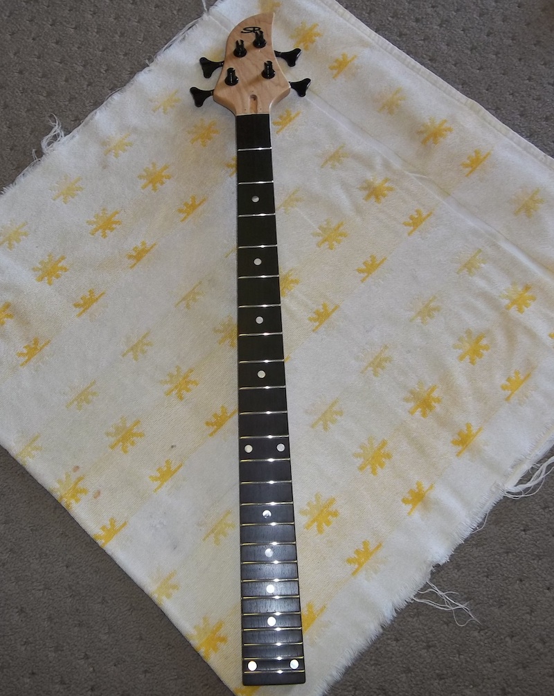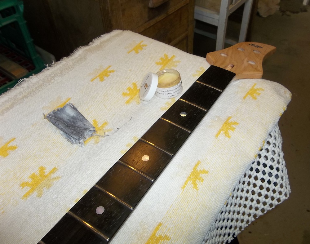 Time to finish up the neck. First, some waxy love for the fretboard. It takes some time to get the wax to the right consistency and a fair bit of effort for the rub on, rub off, but good results when it's done.