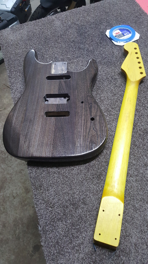 More slow progress. I finally got an hour to shape the headstock (traditional Strat) and apply some Colortone Lemon Yellow before a first coat of Tru-Oil. There's something really satisfying about oiling rock maple!