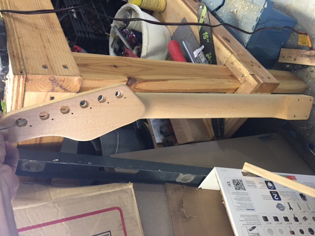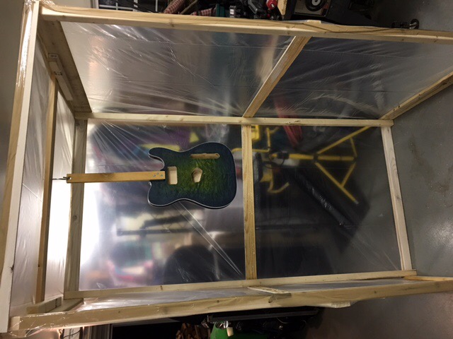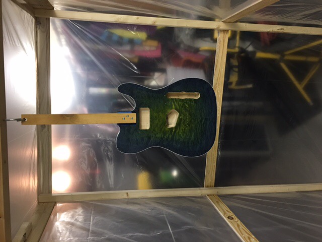 Well I built a make shift spray booth to keep overspray down and dust out, or at least help. I will be spraying the poly this weekend and I have already got about 8 coats of tru oil on neck. I ordered a water slide custom decal instead of the inlay and once it is on I will do some more coats of oil to hide decal paper. Then buffing and polishing.. the end is near..Attachment 19307Attachment 19308Attachment 19309
