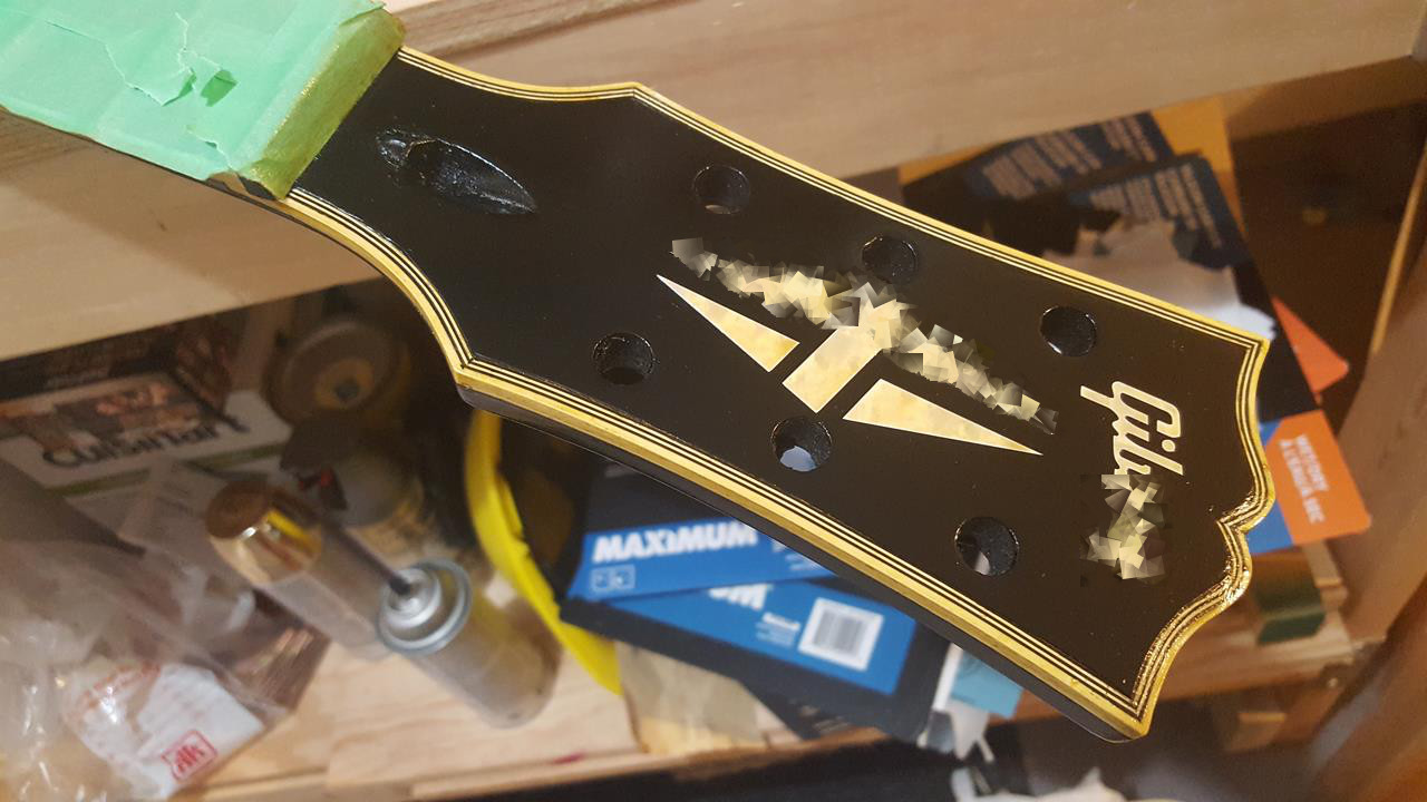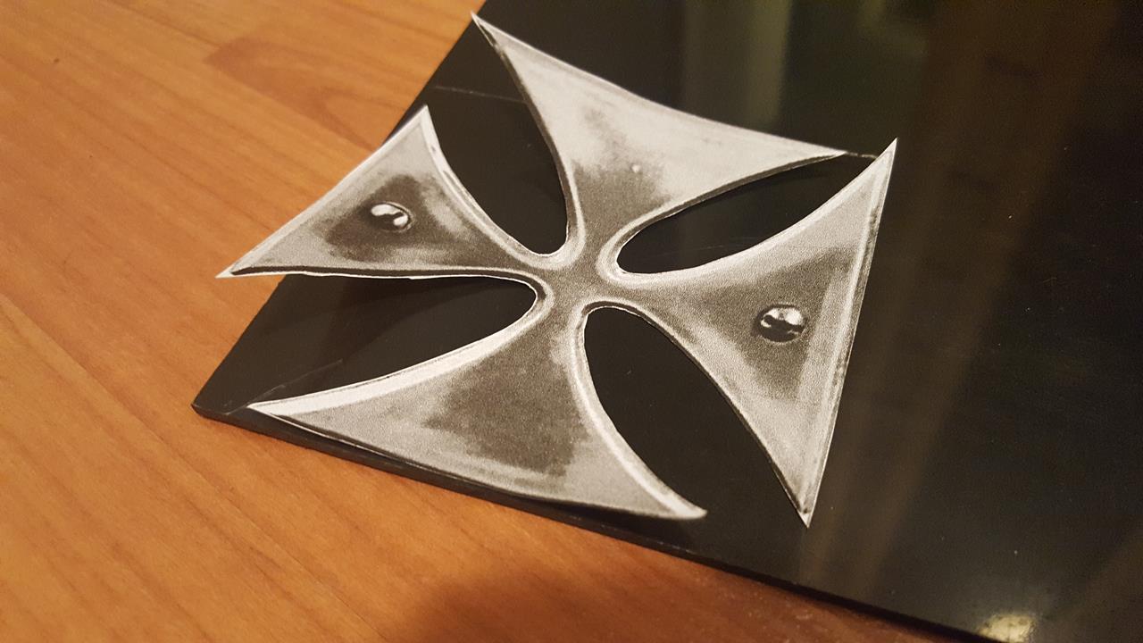 Yes, there will be a worn gold iron cross behind the tailpiece that I haven't made yet. I've printed out a picture of the original to use a guide to cut mine out of a black pickguard blank that I'll paint. There will also be gold vinyl adhesive racing stripes.