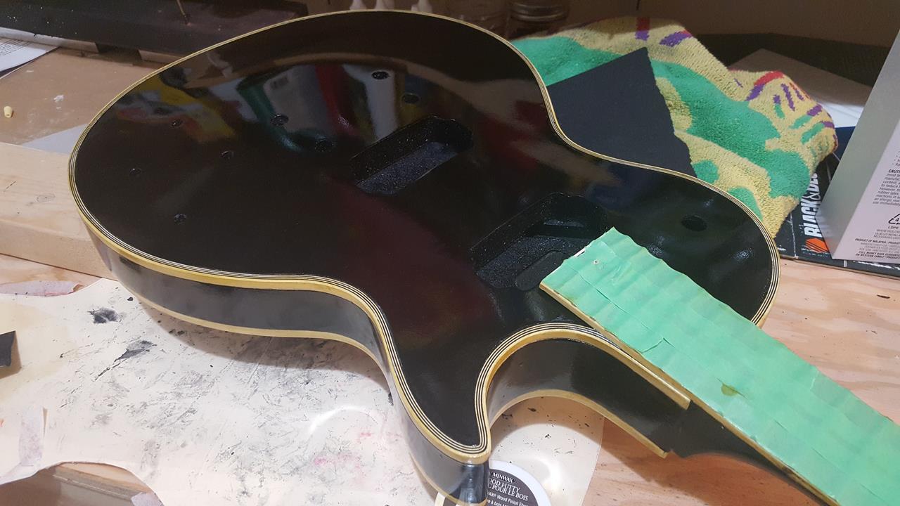 I'm in the middle of the finishing stage at the moment. I have a few coats of amber tinted poly on and the binding and headstock logos are starting to yellow nicely. I think it's pretty close to time to switch to clear coats.