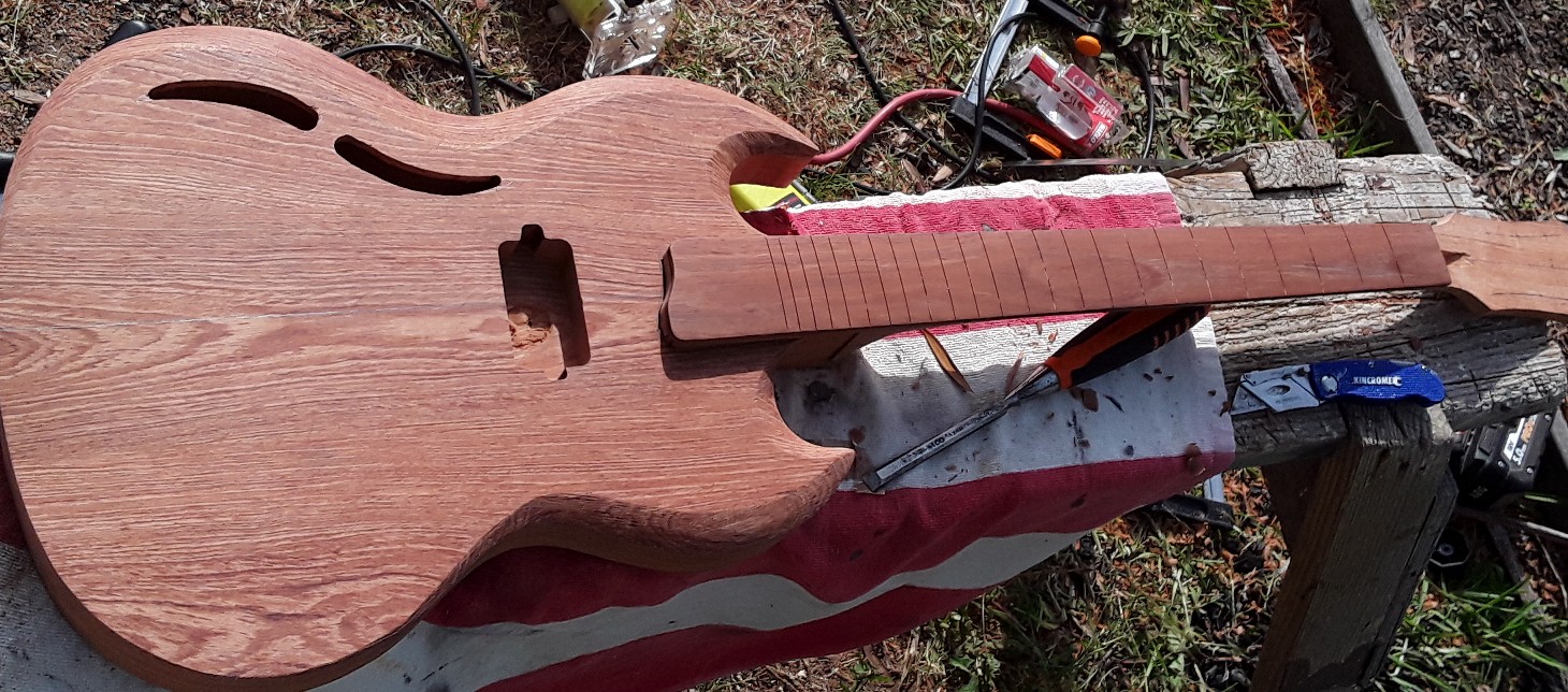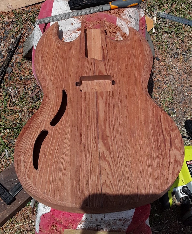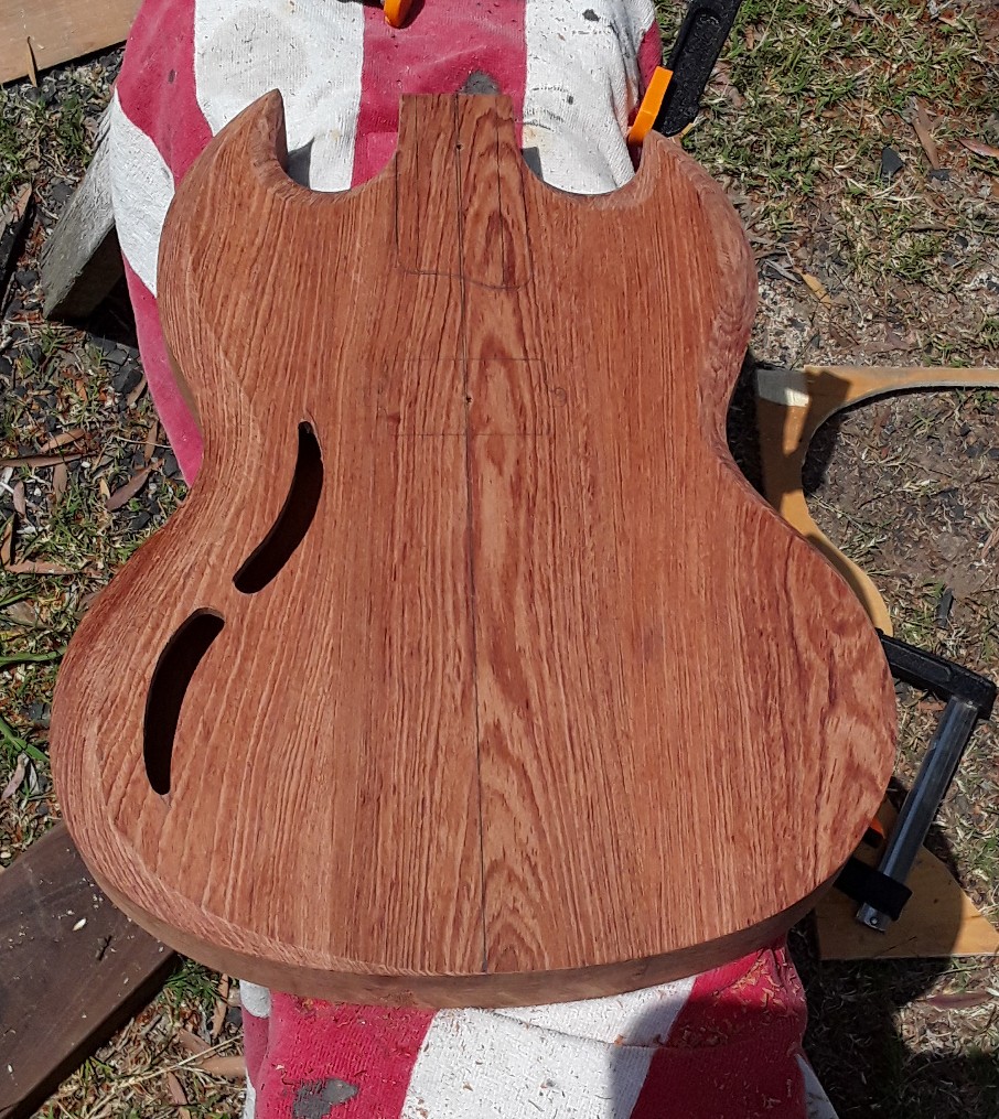 Attachment 28914Attachment 28915 ive had some spare time this arvo and made some router jigs for the neck pocket, pickup and the f hole. Ive finished the fretboard sanding got up to 2000 grit w/d and sanded with some gum turps and its come up like a mirror, no coating on it just sanding it looks and feels amazing