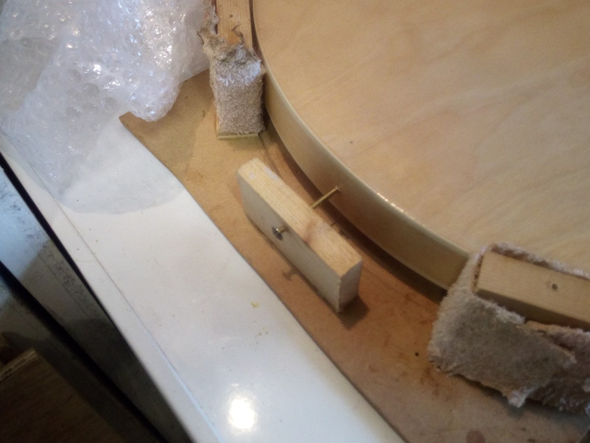 This is what actually locks it in place the screw is threaded through the wood block, but it just rests in the pilot hole for the strap button, because its a pretty big screw it doesn't really go into the body. Thus the instrument is held solid. Without the padded blocks this jig is pretty good for applying tru oil to the back and sides of the body - there's enough space to be able to get the oily rag right round the boy.