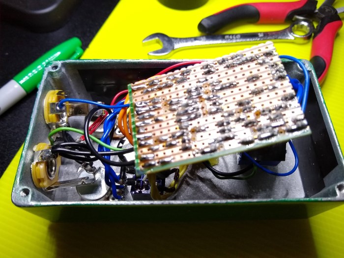 This will be completed pedal #7 for the year (not counting the two unboxed circuits in progress as part of the mini amp). And I am already planning a Barber GC and a Mad Professor Deep Blue Delay for myself. Time to sell the Caline Pure Sky (Timmy clone), the Joyo Sweet Baby (Mad Professor Sweet Honey clone), and the Aroma Acoustic simulator. Or time to build a bigger pedal board :)
