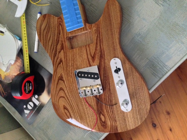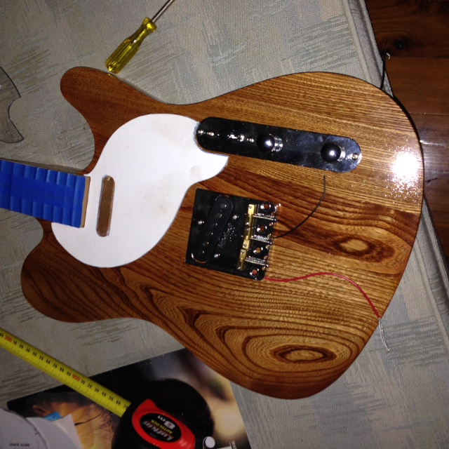 Well its been awhile since I posted on my build. After modifying the original blank of the Tele, ( it almost looks like a lovechild of a Strat and Jaguar), it was the usual sand, sand etc. and then stain, sand, sand, as I couldnt get the results I was looking for. The pics are as it stands at the moment, happy with the front and neck, not sure about the back, ( no photos). Wife loves the back!