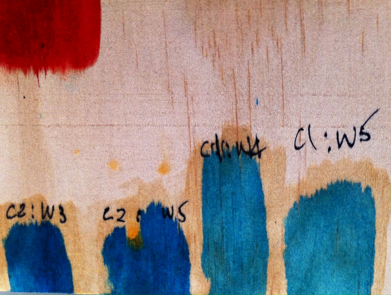 Rockmof, the Cyan comes out very dark straight from the bottle. Unfortunately iPhone photo colouring is not always a true representation as C1:W4 & C1:W5 are actually quite light and aqua/turquoise to the naked eye and somewhere near the colouring I am chasing for my flame top tele. The notations mean C1 = 1 part Cyan to W4 = 4 parts Water, etc.