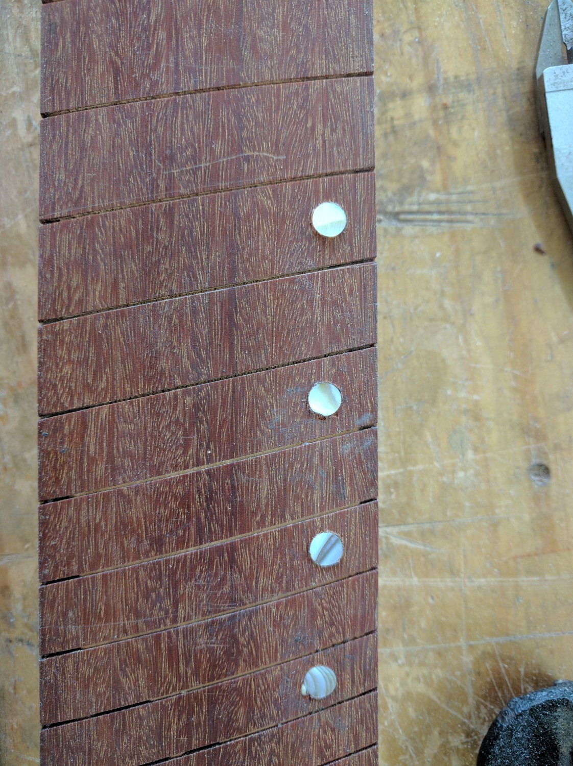First up was inlays. Opted for Black Lipped Mussel (as nice as Pāua is these stood out compared to the dark red a little better). There was a really nice variety of colour in the pieces, and I tried to arrange them a little bit by how light and dark they were. Lighter near the centre of the fretboard, darker towards the outside.