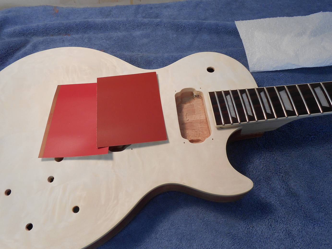 I hope to get something between these two colour chits for the cap and headstock. I am using Colortone's Mahogany Red brightened with Cherry Red. Test have been successful so now for the real thing. I will try gavinturner's advise and wipe on and off a couple of times to try to make the quilted top pop. I dare not sand as usual(see previous).